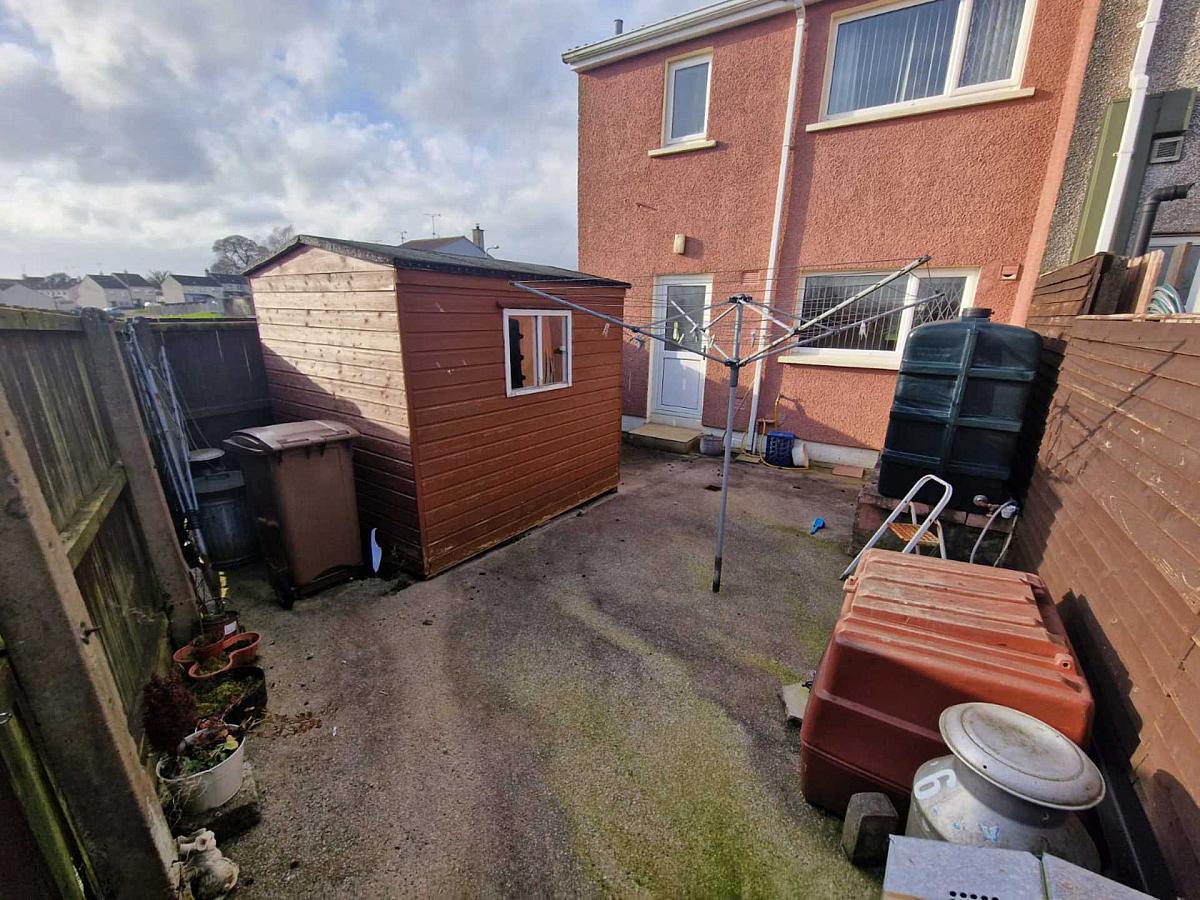 The front of the property offers a decorative paved area, to the side is a large enclosed lawn with boundary fence, to the rear is a yard with shed for storage.