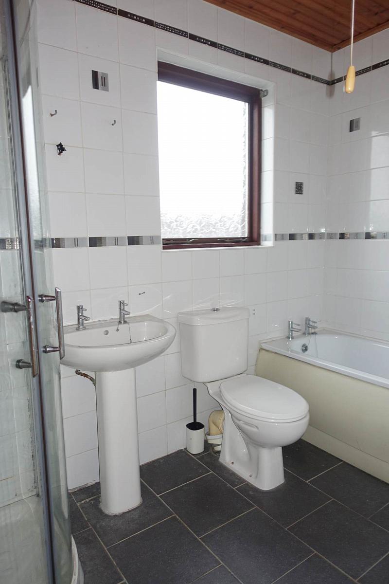 White suite, step in shower cubicle with electric shower, fully tiled , panelled ceiling.