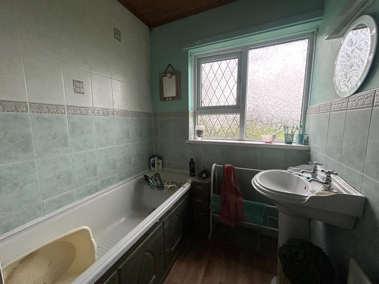 Bathroom: Bath with shower over, wc, whb, part tiled walls.