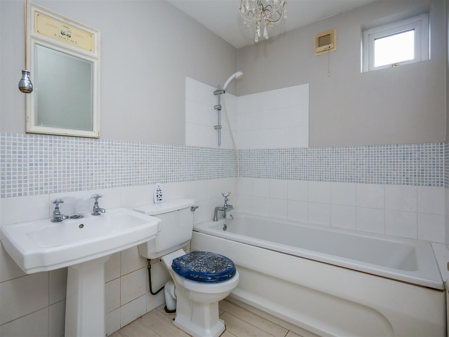 White bathroom suite comprising of panelled bath, pedestal wash hand basin and low flush w.c. Part tiled walls and tiled flooring.