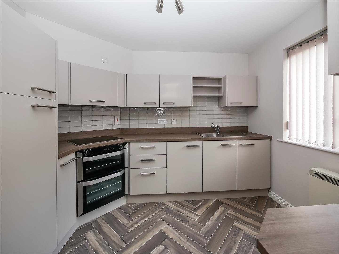 Modern fitted kitchen with a range of high and low level units, single drainer sink unit with mixer taps, formica work surfaces, 4 ring hob and double oven, extractor fan. Fridge freezer space, breakfast bar.