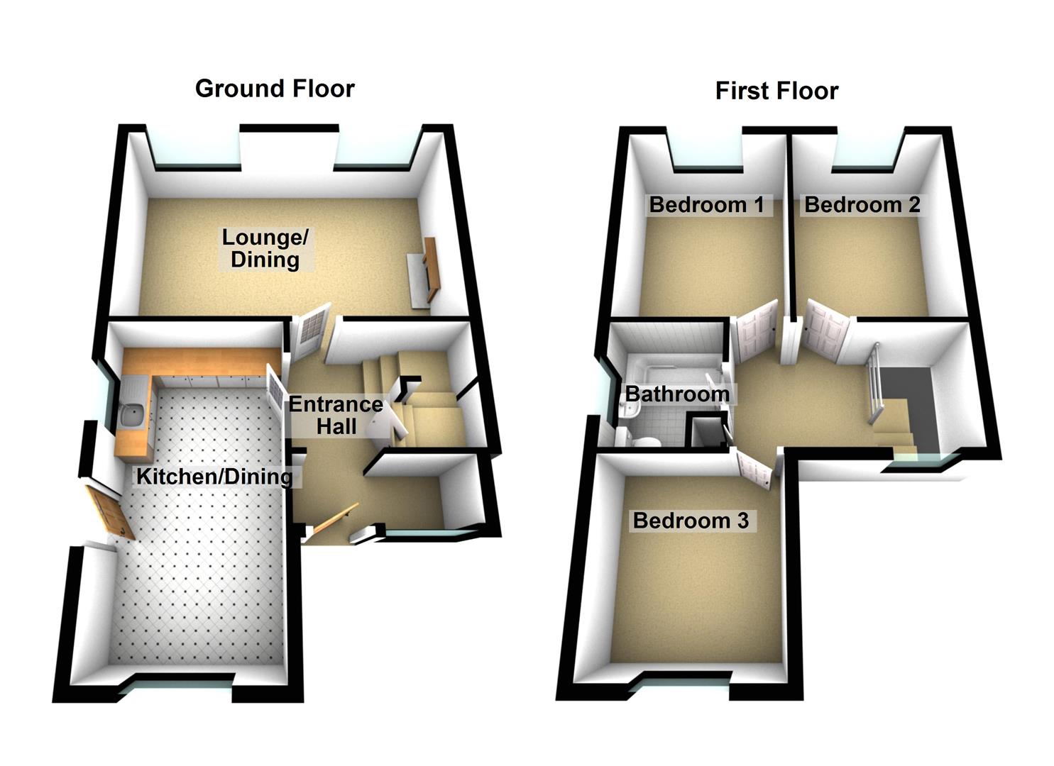 Internally the property comprises three bedrooms, kitchen dining to the front, lounge dining to the rear and white bathroom suite on the first floor.