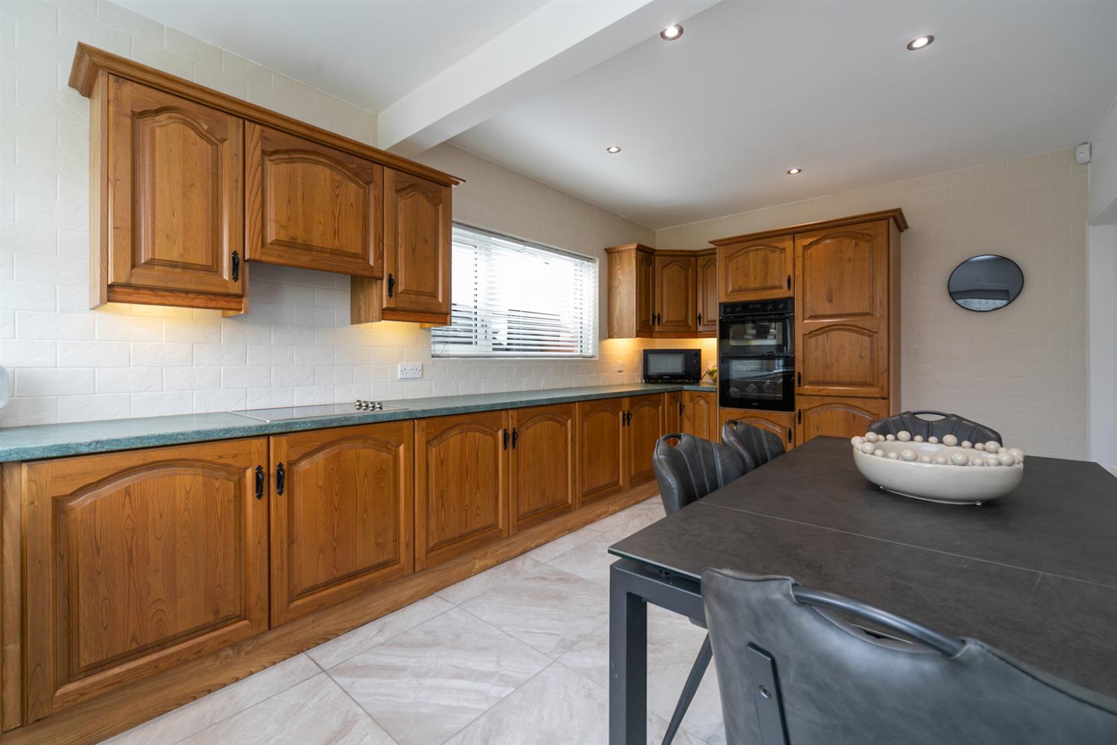 Excellent range of high and low level units, built in hob, overhead extractor fan, double oven, integrated fridge freezer. Fully tiled walls.