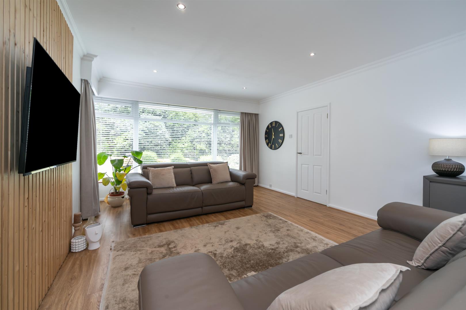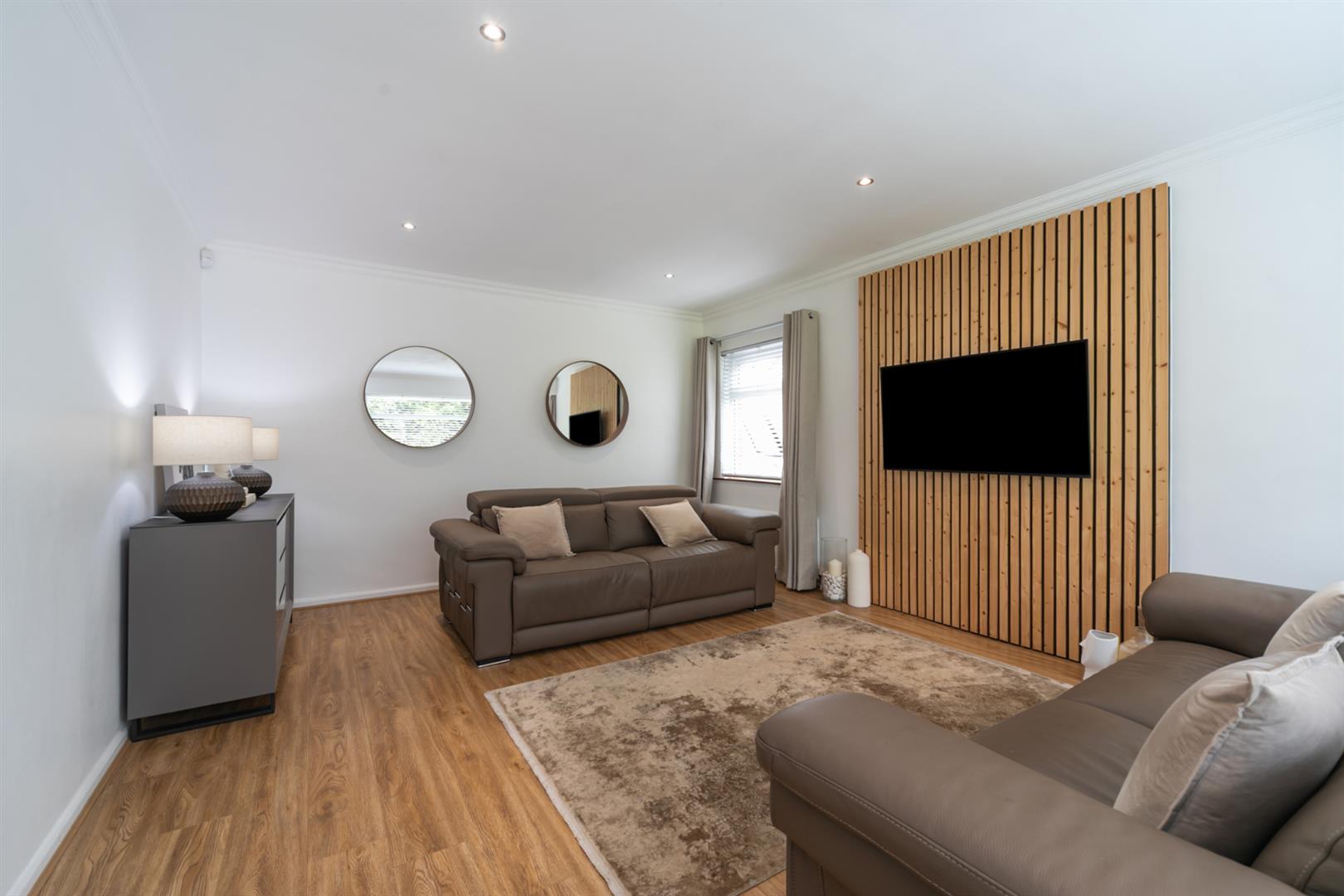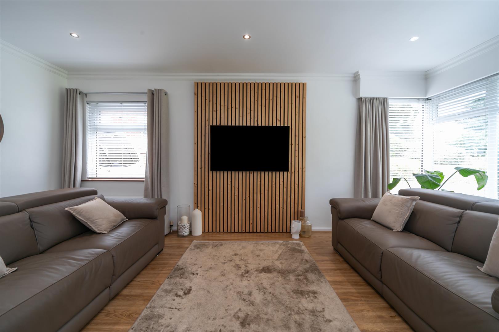 Feature wood panelled wall with mounted T V Laminate flooring. Spot-lights.