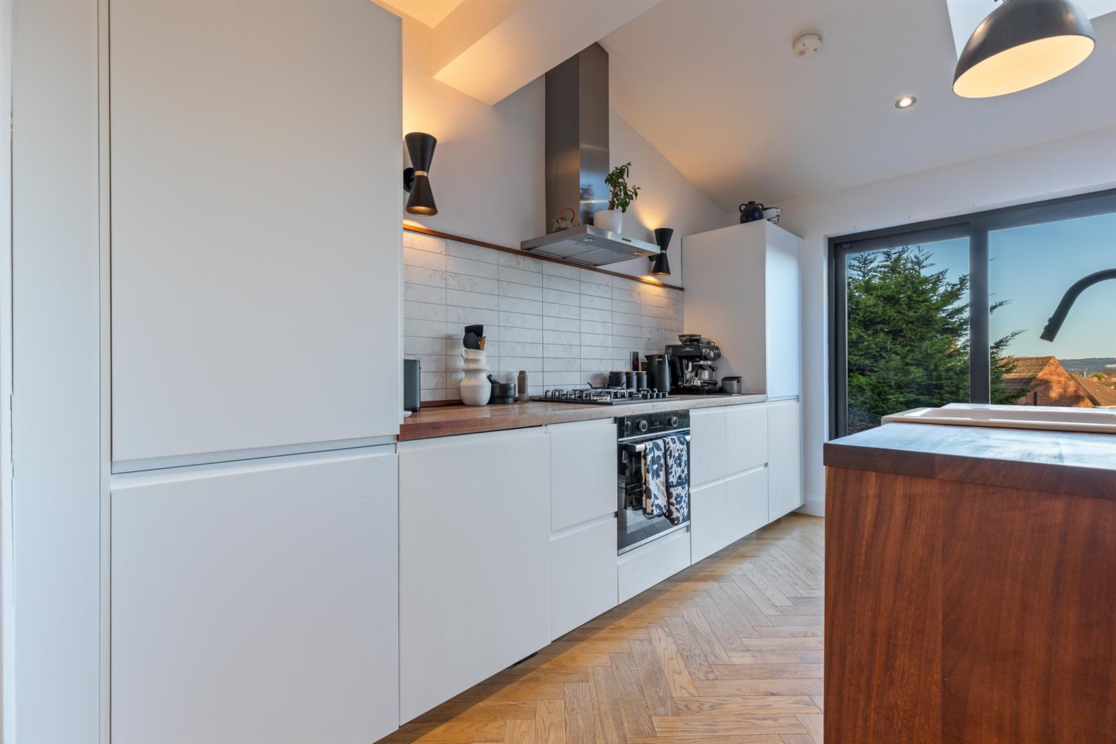 Full range of high and low level handleless units, wooden work surfaces, built in gas hob and oven, stainless steel overhead extractor fan. Integrated fridge freezer. Centre island stand with sink wrap around wooden work surface integrated dishwasher, breakfast bar area, Oak flooring in herringbone style. Double glazed sliding doors to garden. Excellent views out to Stormont