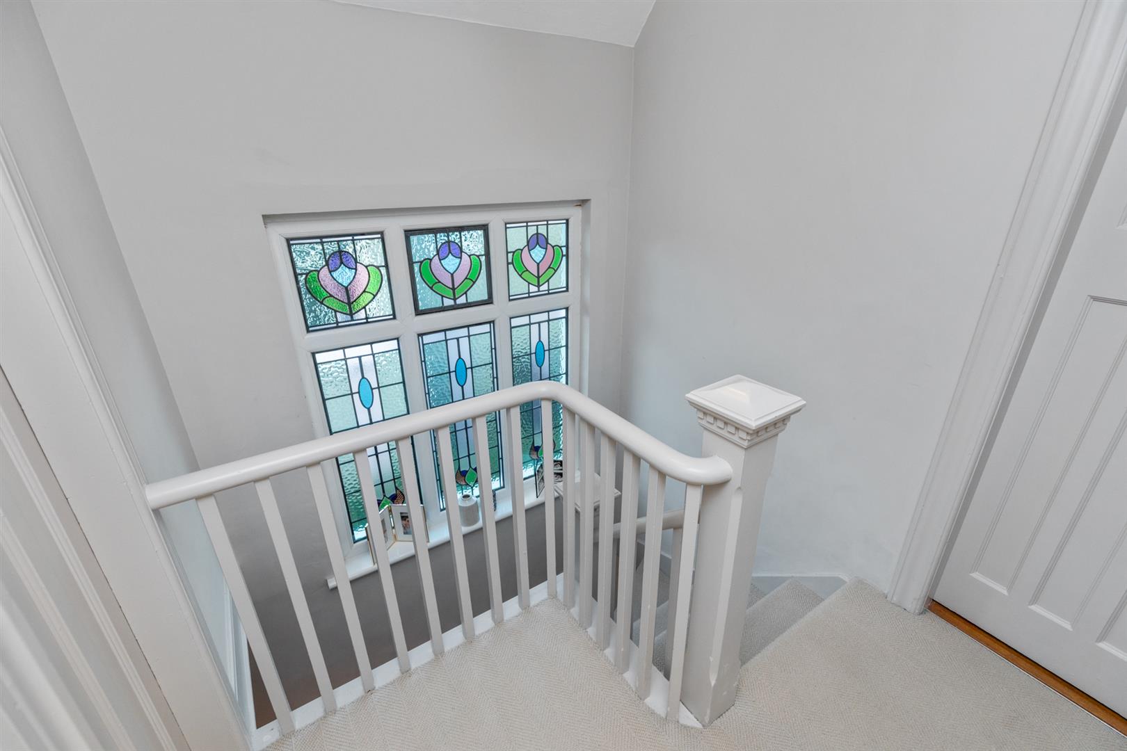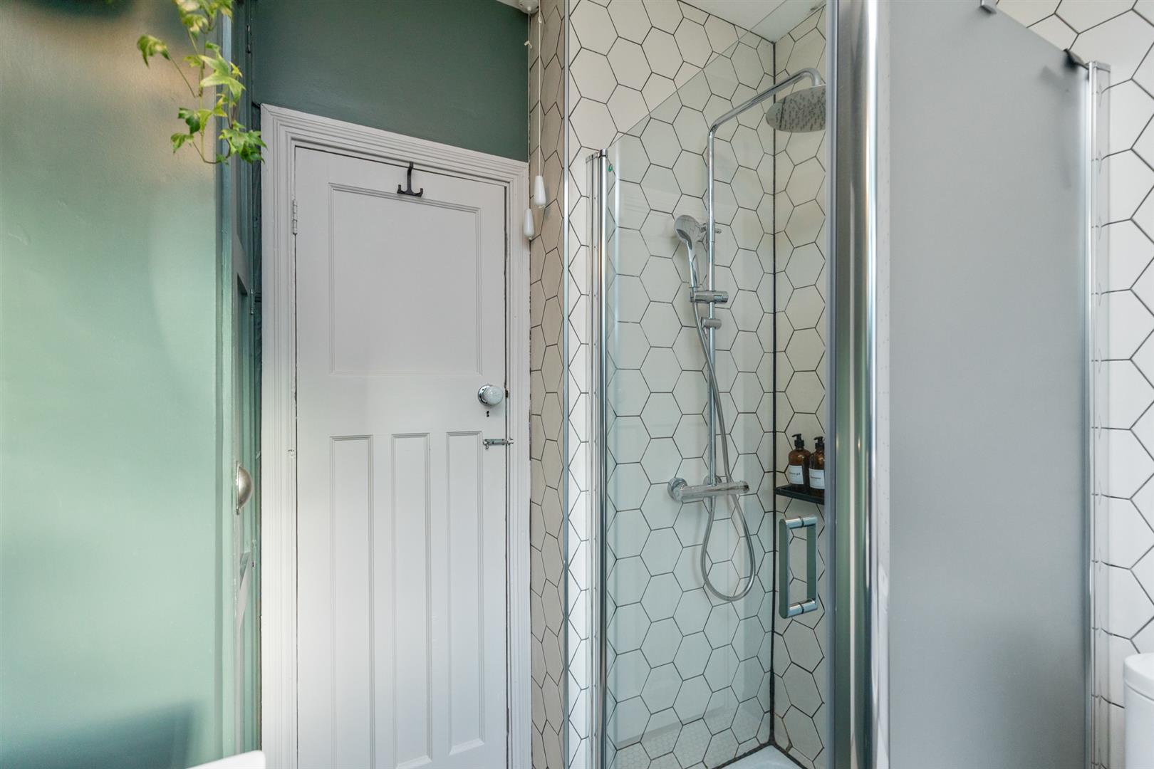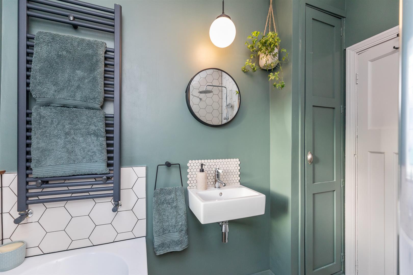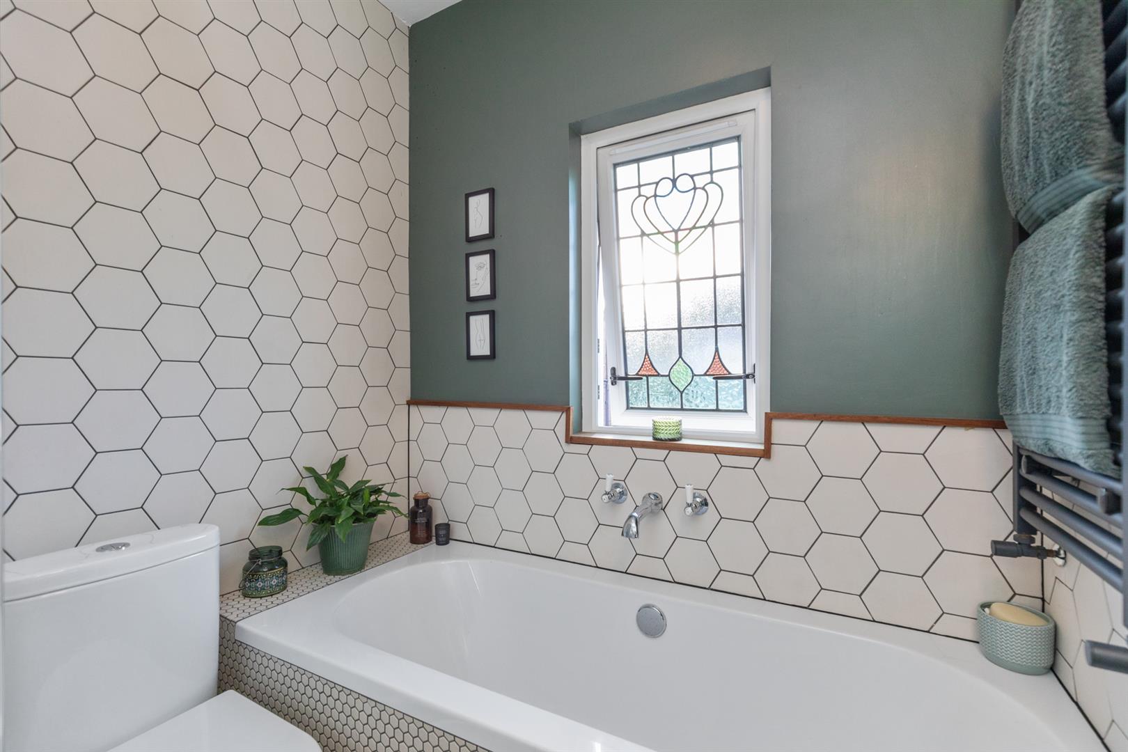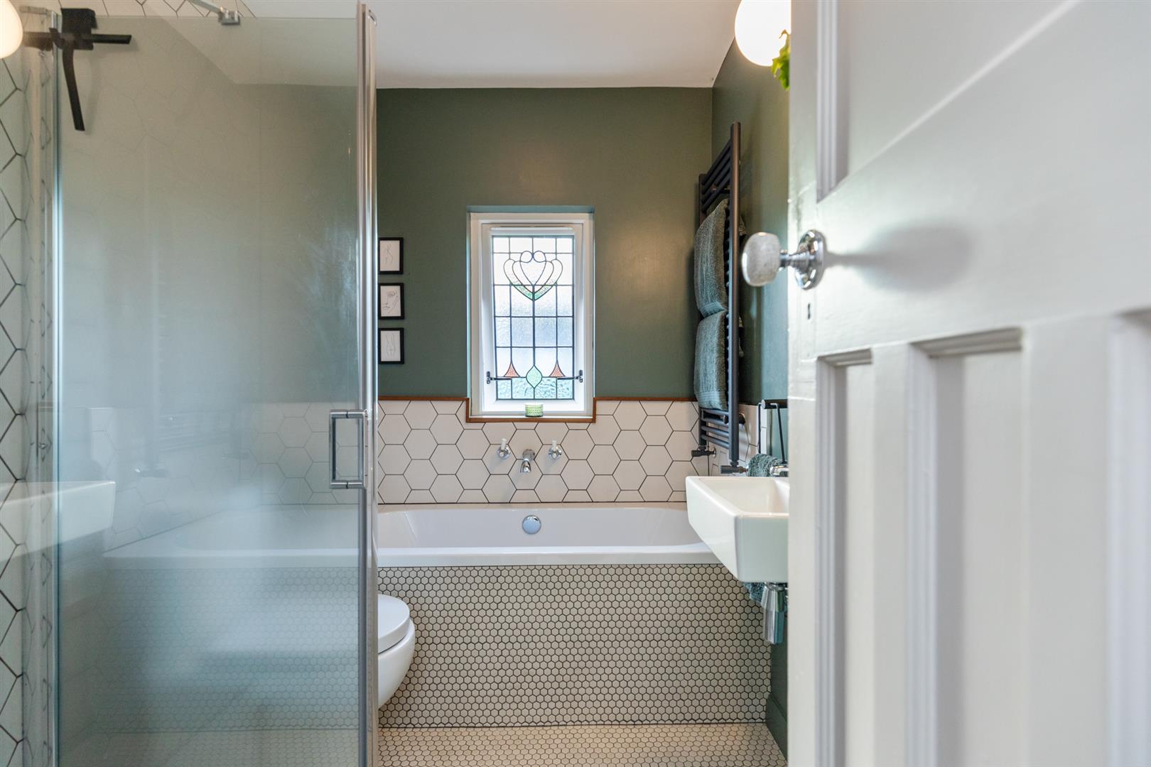 Comprising tiled hexagon mosaic wall tiling, panelled bath with wall mounted mixer taps. Separate shower cubicle with chrome shower unit, drench head and hand shower, wash hand basin with mixer taps, low flush w.c Part tiled walls. Stained glass window. Heated anthracite grey towel rail. Hot-press housing radiator.