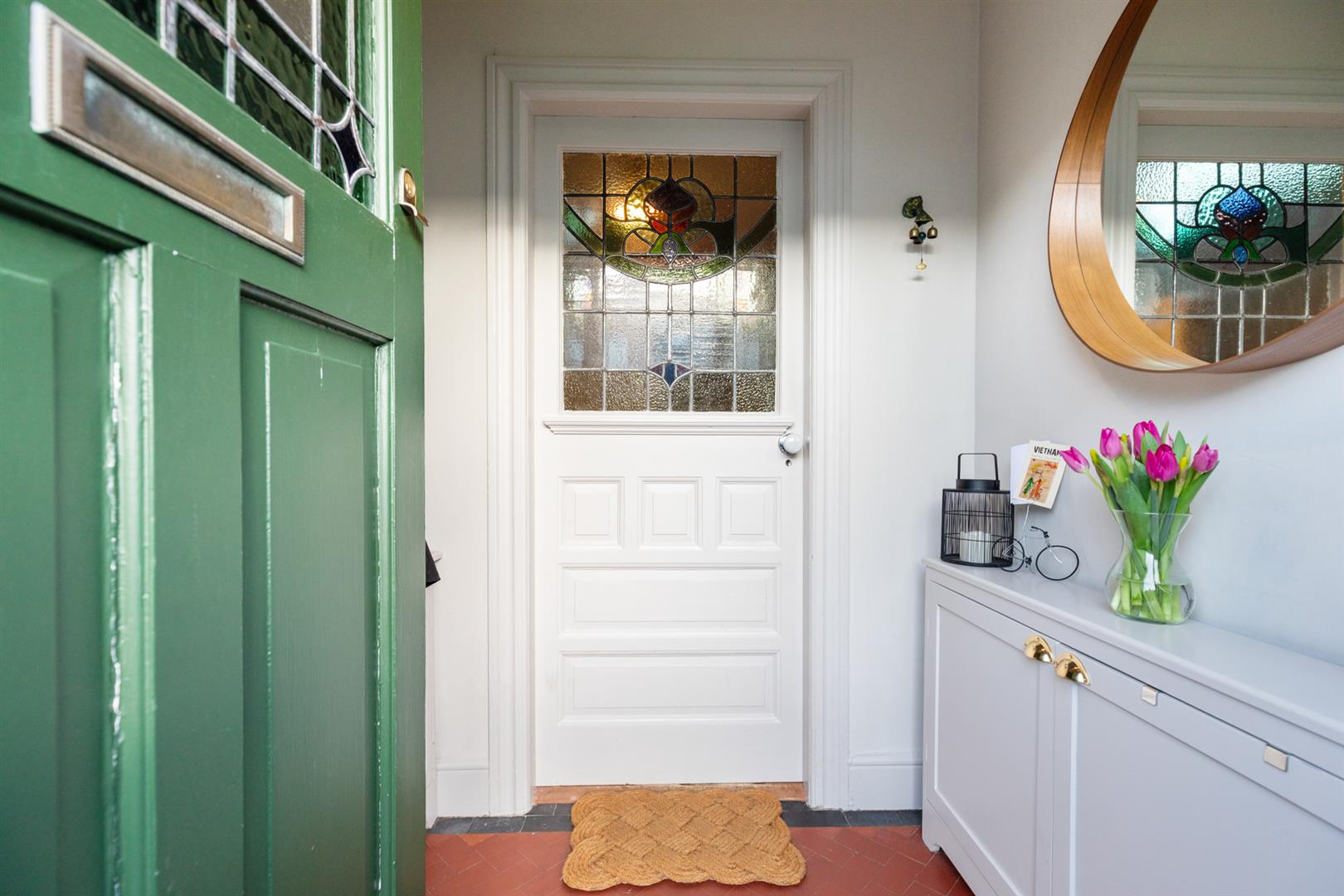 Hardwood stained glass panelled front door with matching side panels to entrance porch. Terracotta tiled flooring. Stained glass inner door to hallway.