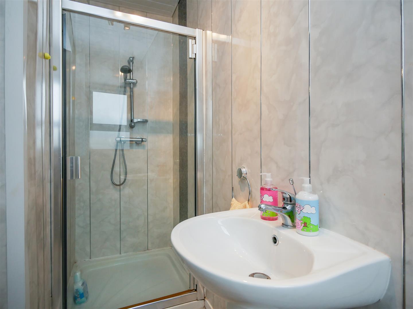 Comprising walk in shower cubicle with chrome shower unit above, pedestal wash hand basin, low flush w.c Pvc ceiling.