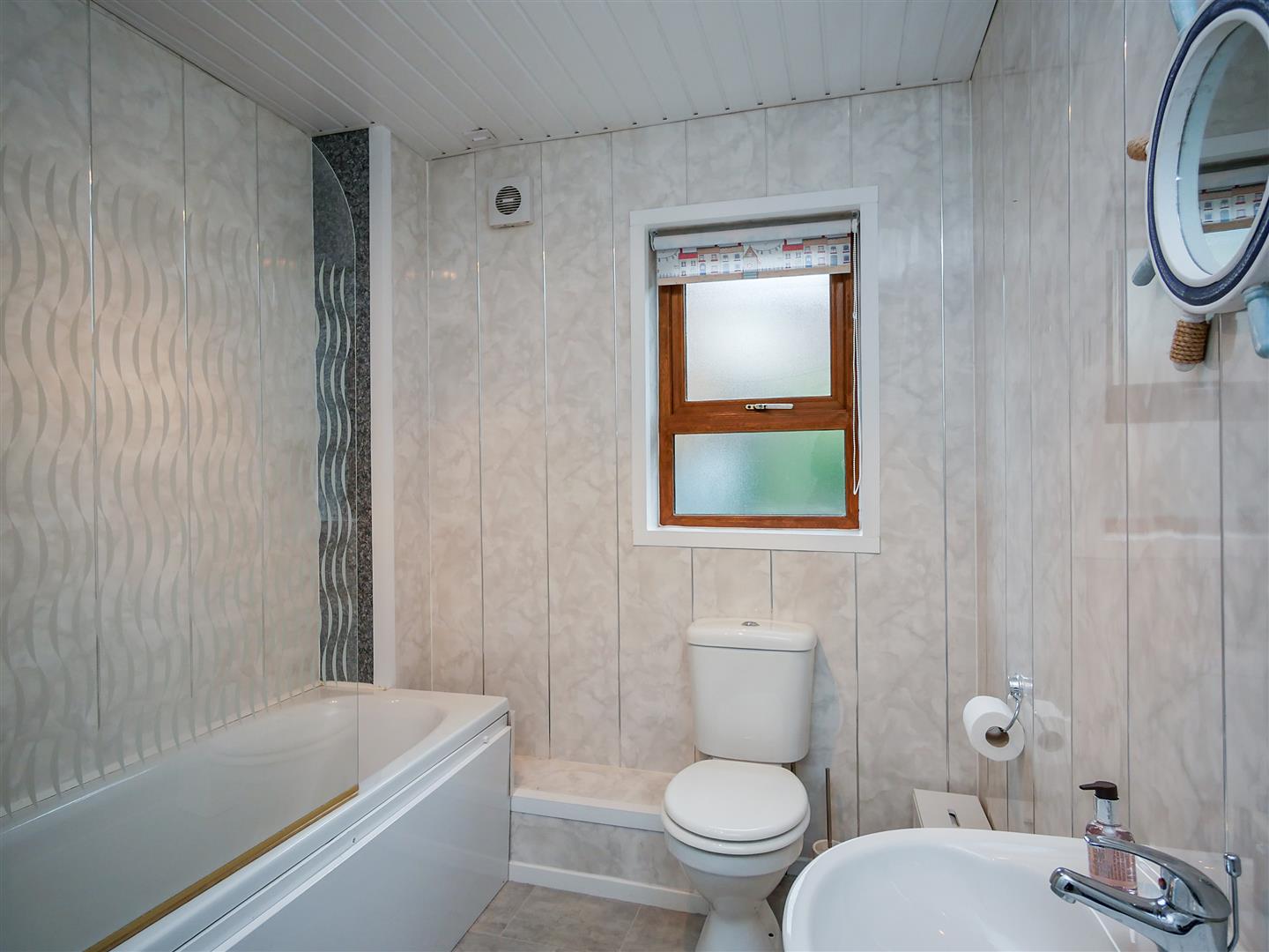 Comprising panelled bath with mixer taps, shower unit above, pedestal wash hand basin, low flush w.c Pvc ceiling.