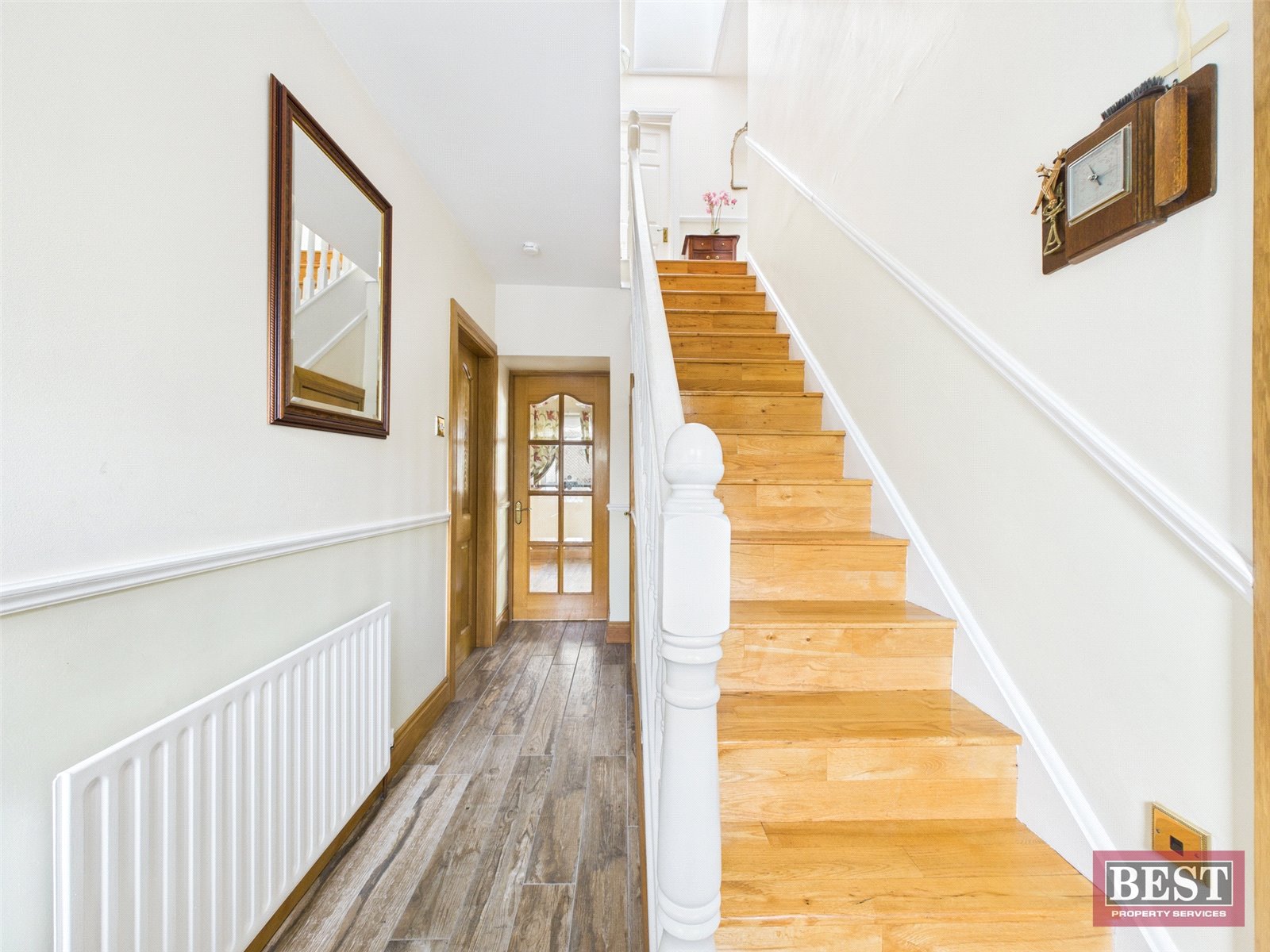 On entering the home, the tiled hallway features wooden stairs leading to the first floor, with useful under stair storage and access to the kitchen at the rear.