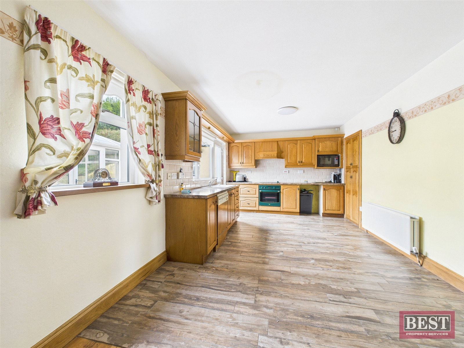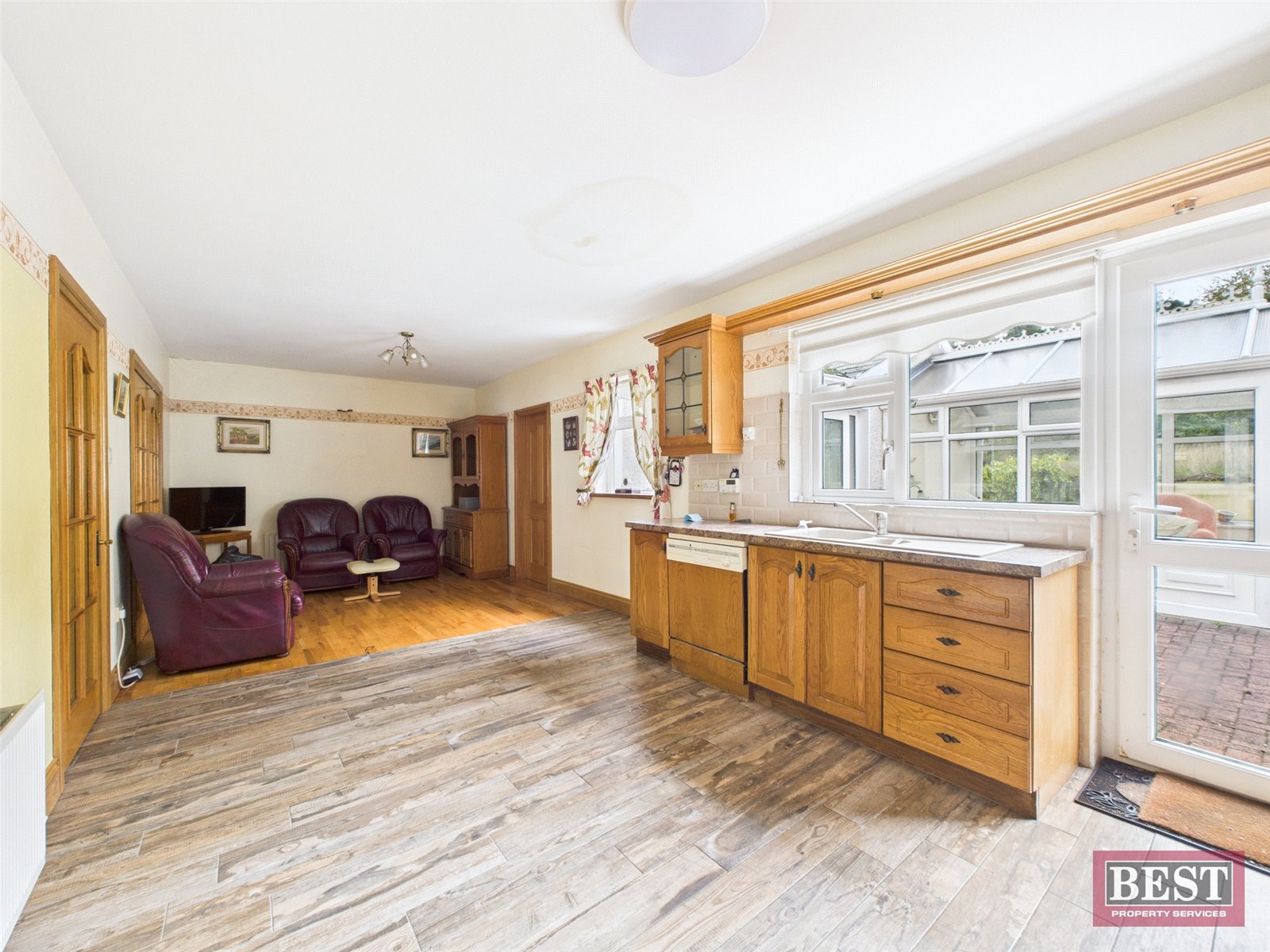 The kitchen, located to the rear, is fitted with a range of upper and lower-level units, oven and hob, integrated dishwasher, and space for further appliances. The adjoining dining area features wooden flooring and provides access to a ground-floor bedroom at the back of the property, which benefits from an adjoining fully tiled wet room with toilet, wash hand basin, and shower.