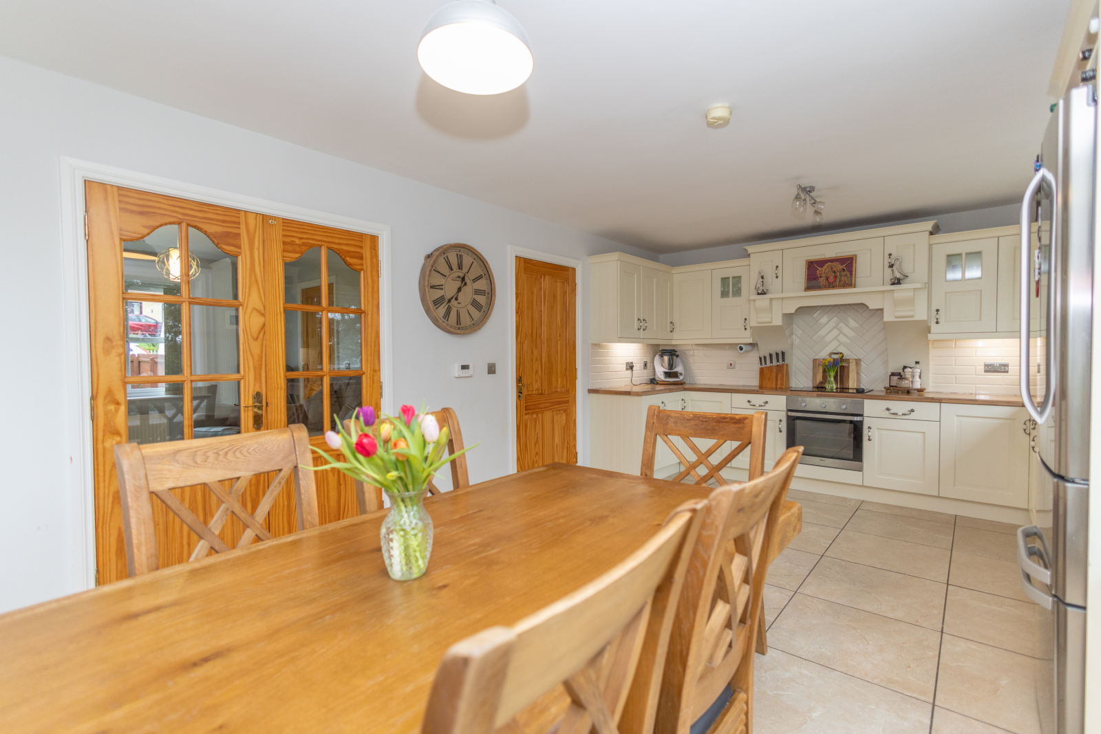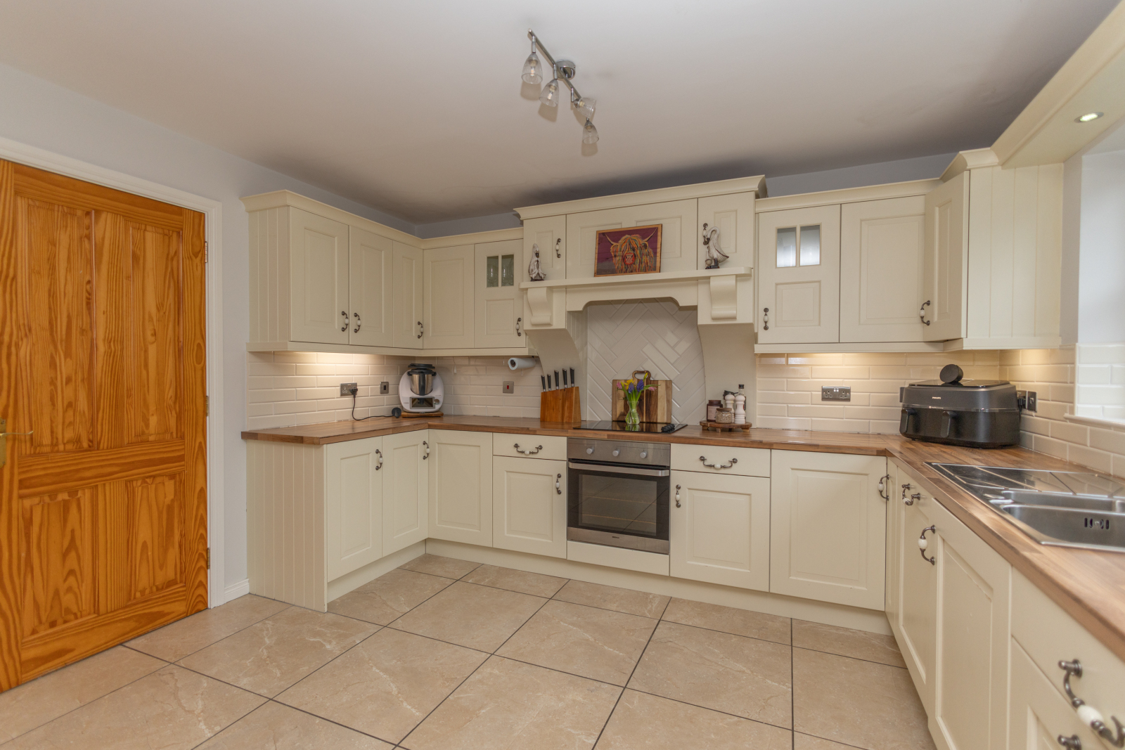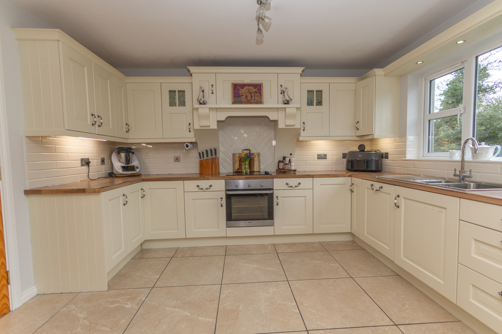 Decorative tiled floor, High and low level storage units, recessed down lighting, electric Ignis hob and Beko cooker, subway tile splashback, stainless steel sink and sockets, American style Fridge, dishwasher and extractor fan.
