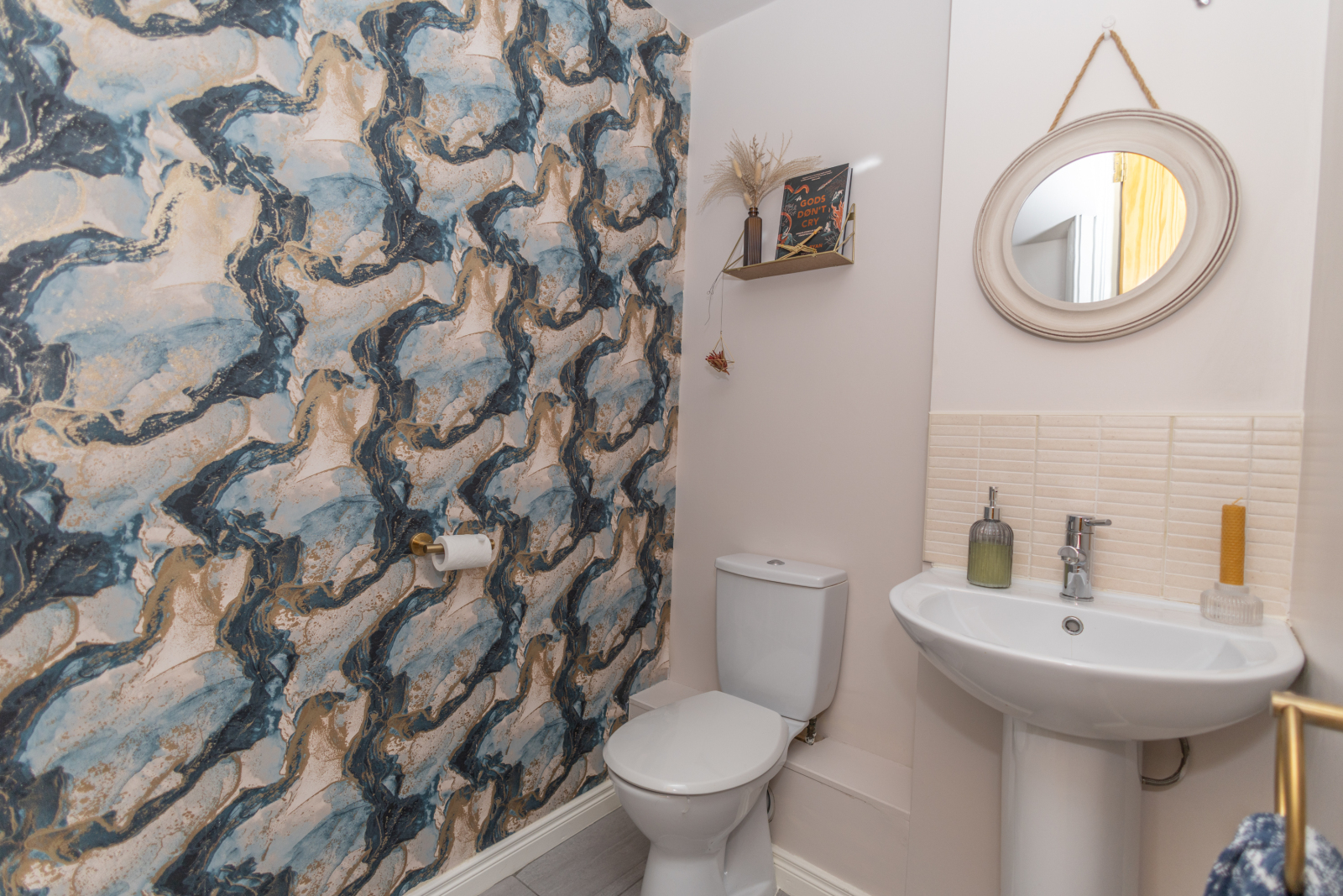 Decorative wallpaper, toilet, sink.