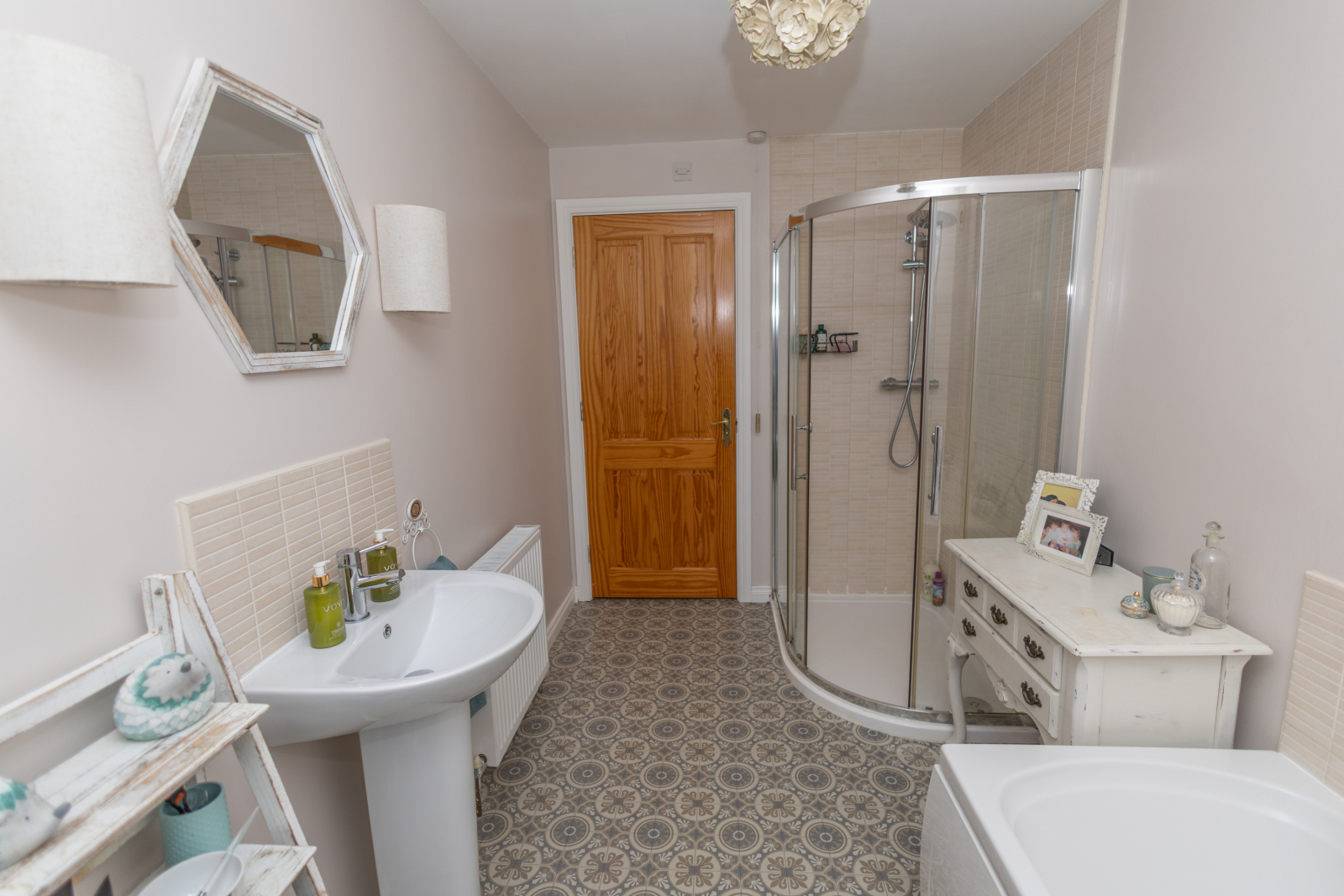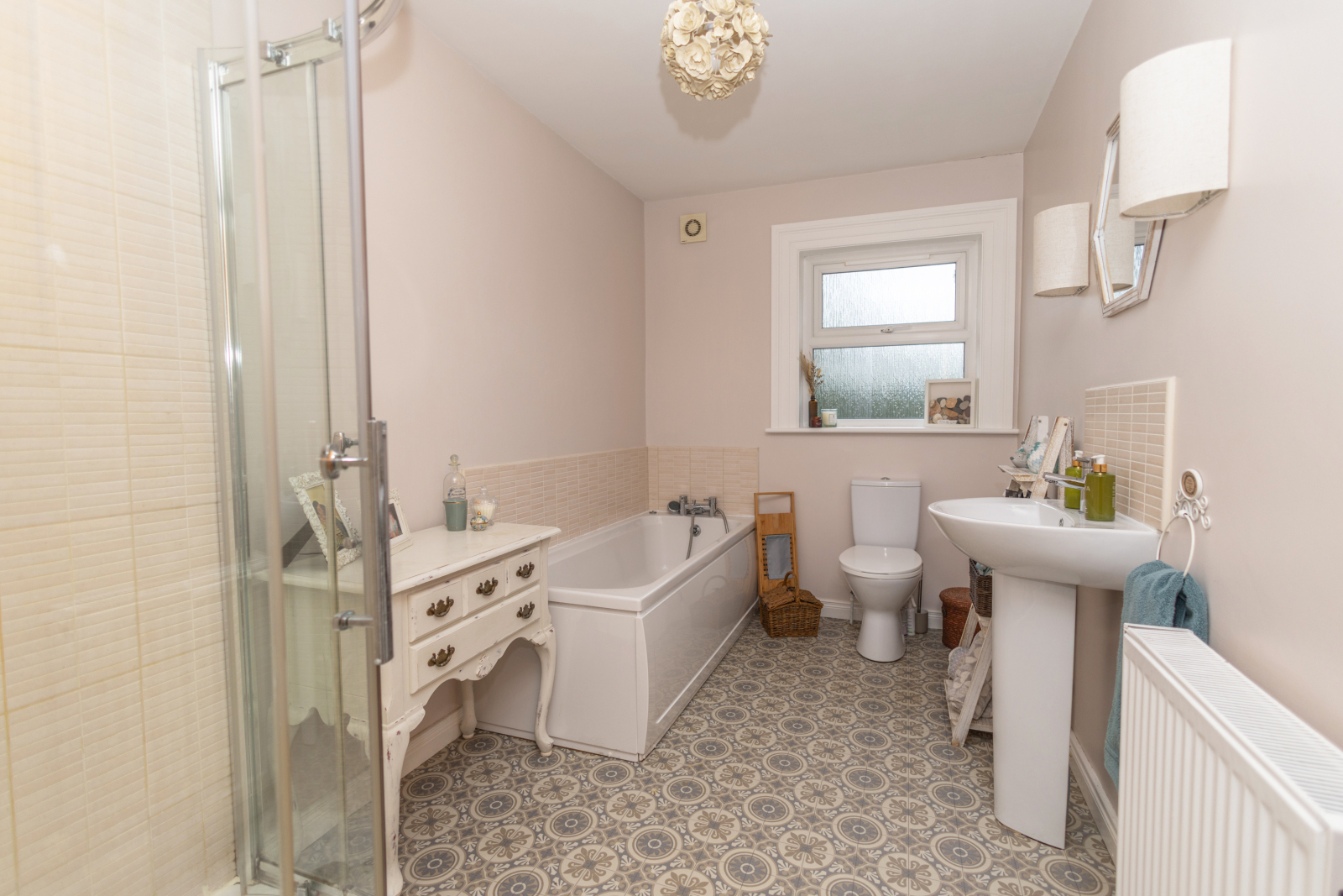 Tiled style vinyl flooring, toilet, sink, bath and seprate shower.