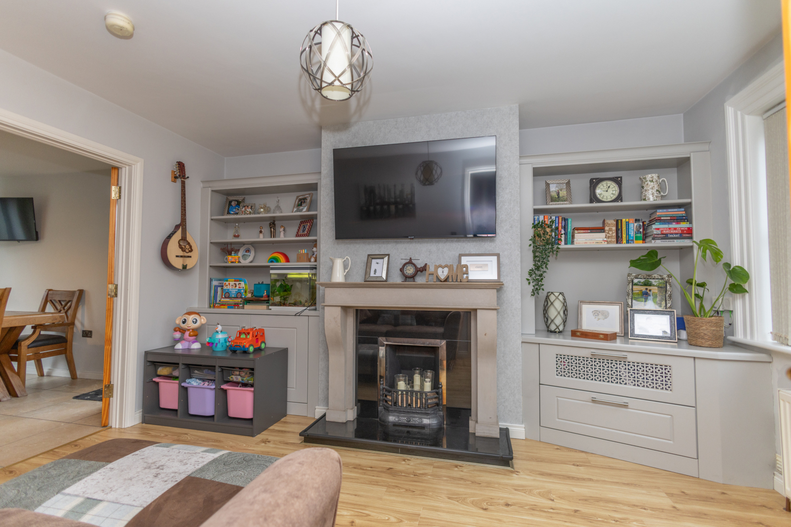 Laminate floor, PVC Double Glazing, built in shelving/ storage units, open fire, tiled hearth with stone effect surround and cast iron inset, double doors leading to kitchen/ dinning room.