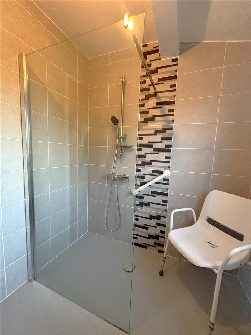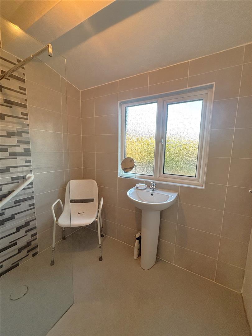 Fully tiled modern white suite comprising walk in shower, thermostatically controlled telephone handset shower, vanity unit, chrome radiator, hot press, tiled walls, ceramic tiled floor.