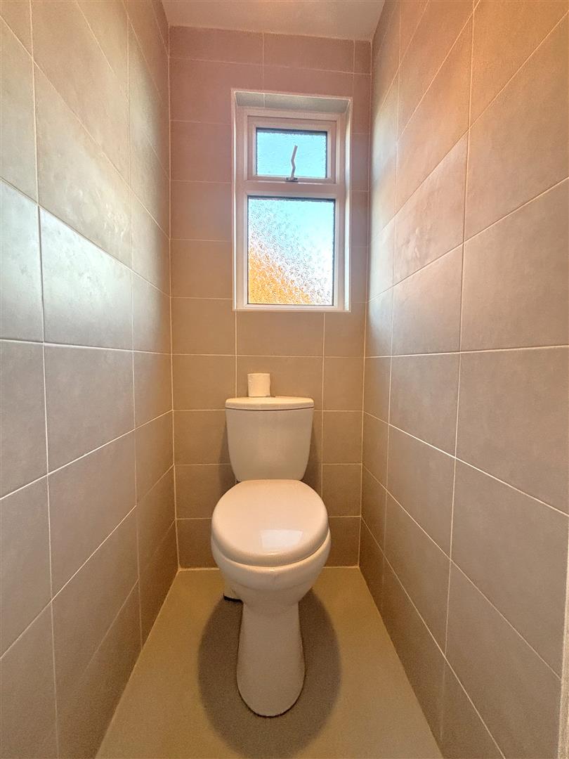 Fully tiled modern white suite comprising low flush wc, tiled walls, tiled floor.