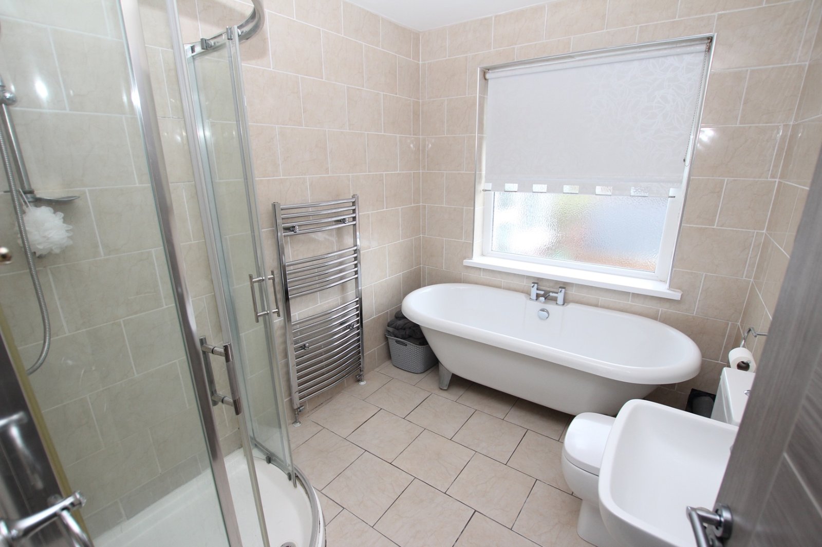 Modern four piece comprising free standing roll top bath, separate walk in shower cubicle with electric shower. Low flush WC and wash hand basin. Large chrome heated towel rail. Tiled flooring and tiled walls.