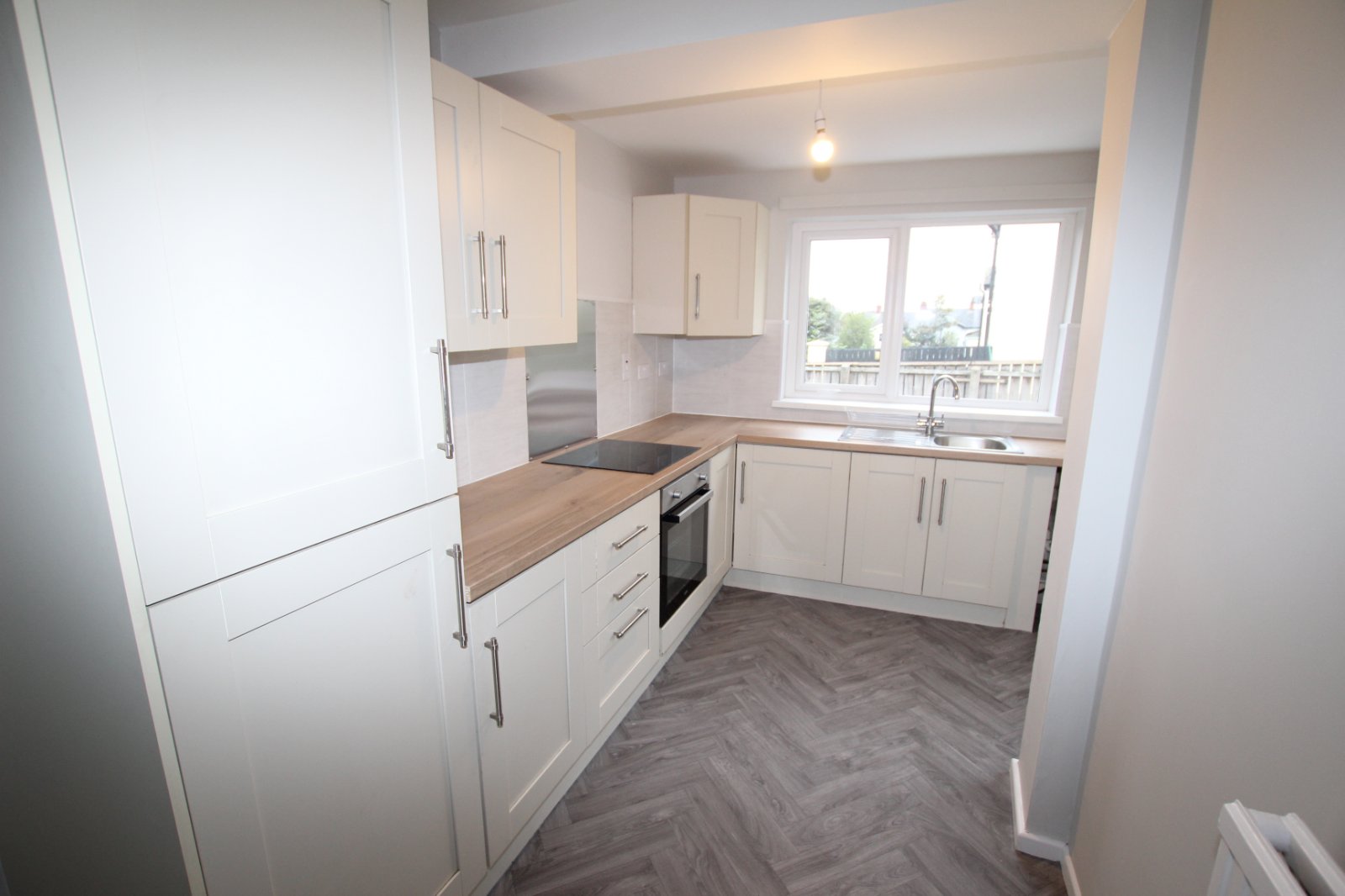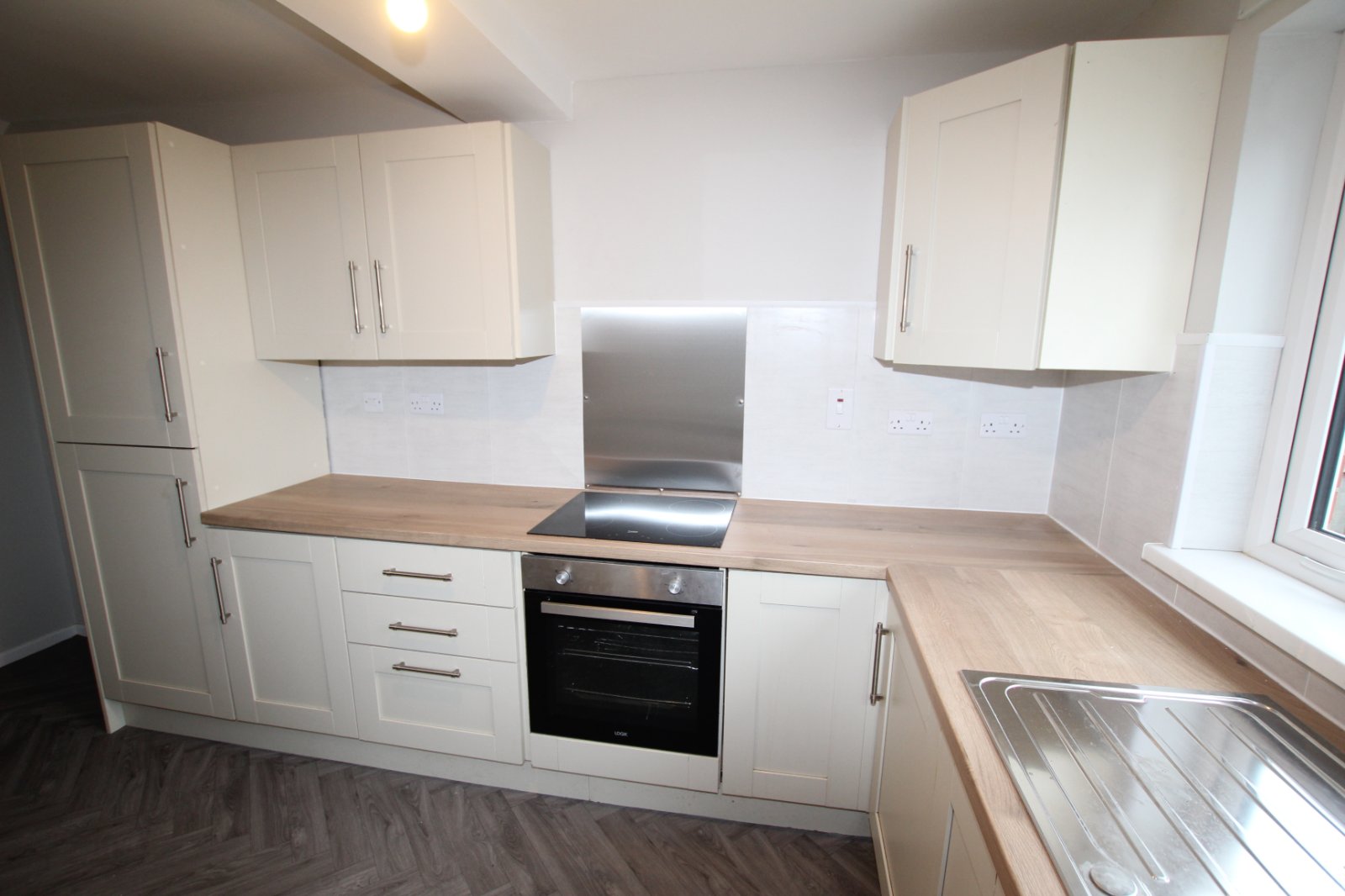Modern kitchen comprising a range of high and low level shaker style units with matching work surfaces, space for a range of free standing electrical appliances.
