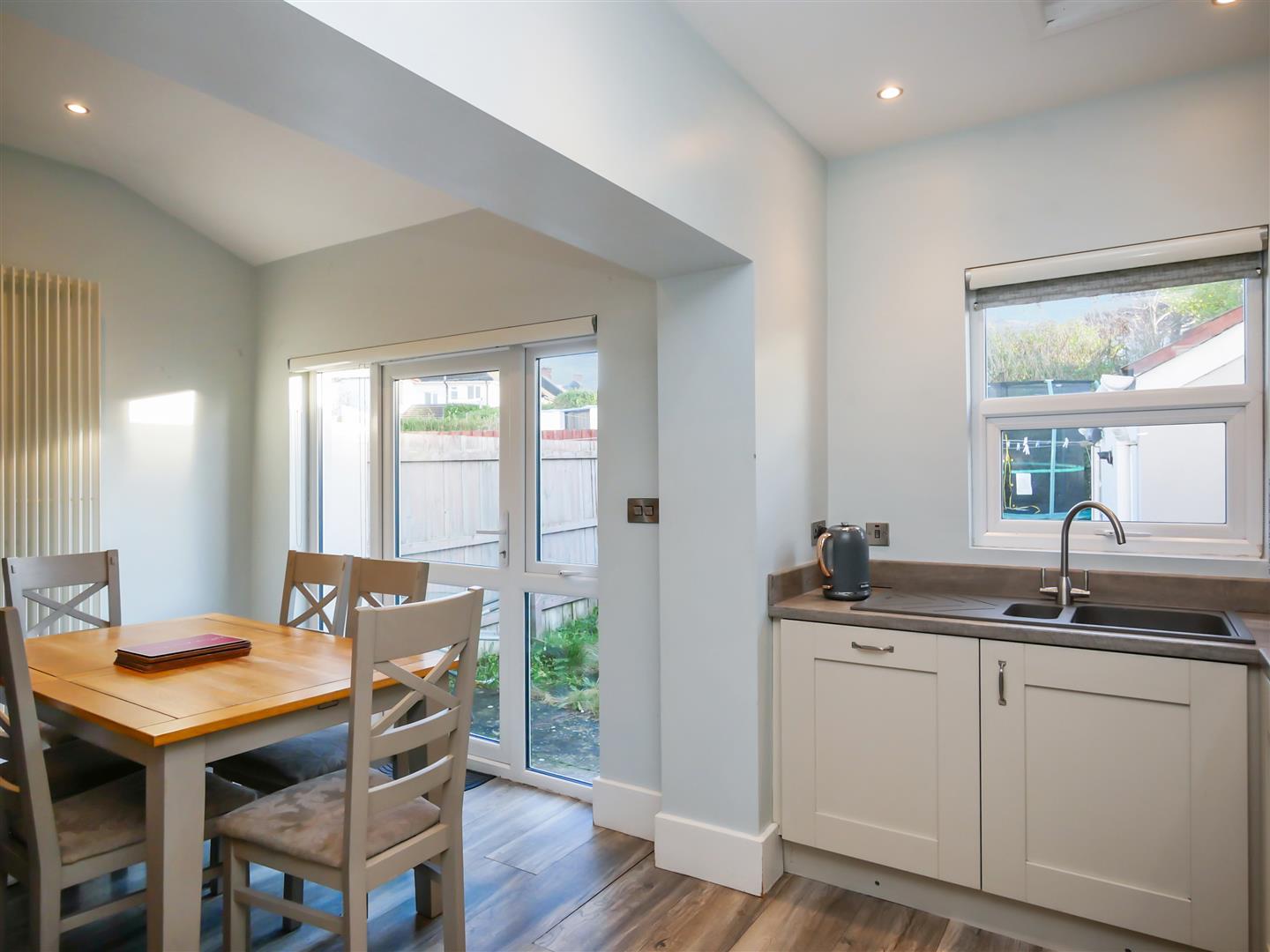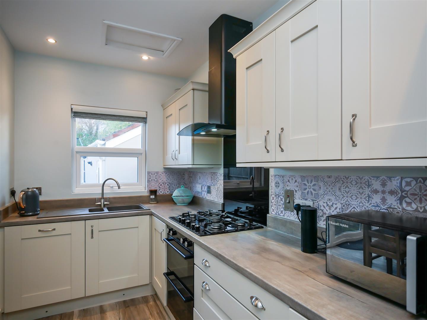 Shaker style kitchen, single drainer 1 1/4 bowl sink unit, with mixer taps. built in 5 ring gas nob and double oven, overhead extractor fan, integrated fridge and freezer, integrated dishwasher. Laminate flooring. Pvc patio doors with glazed side panels.