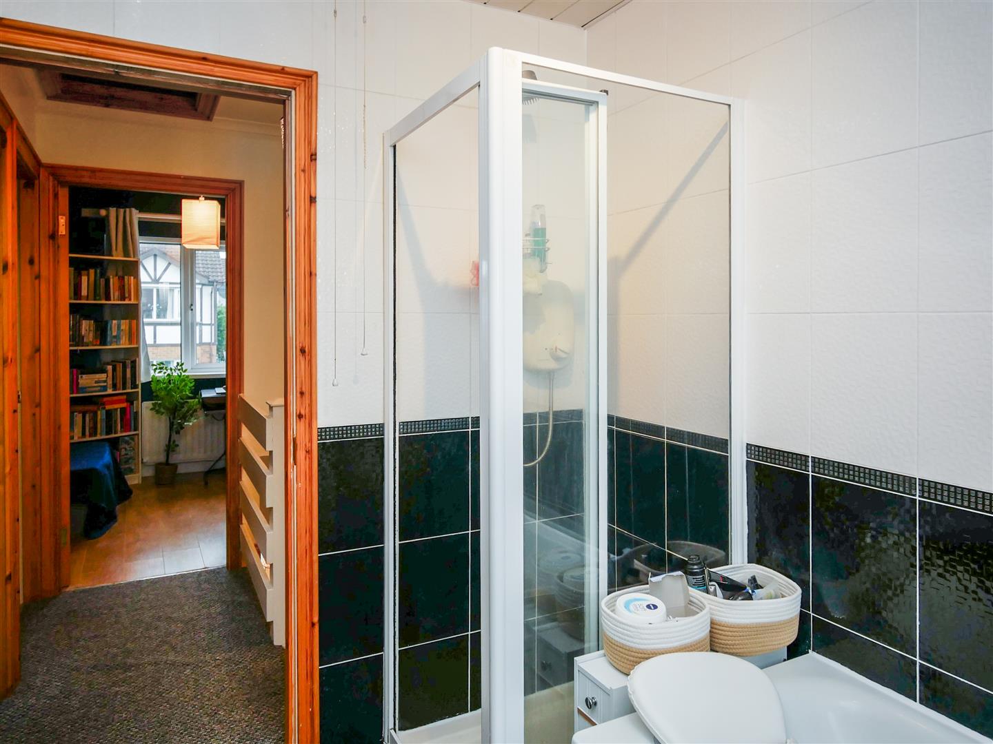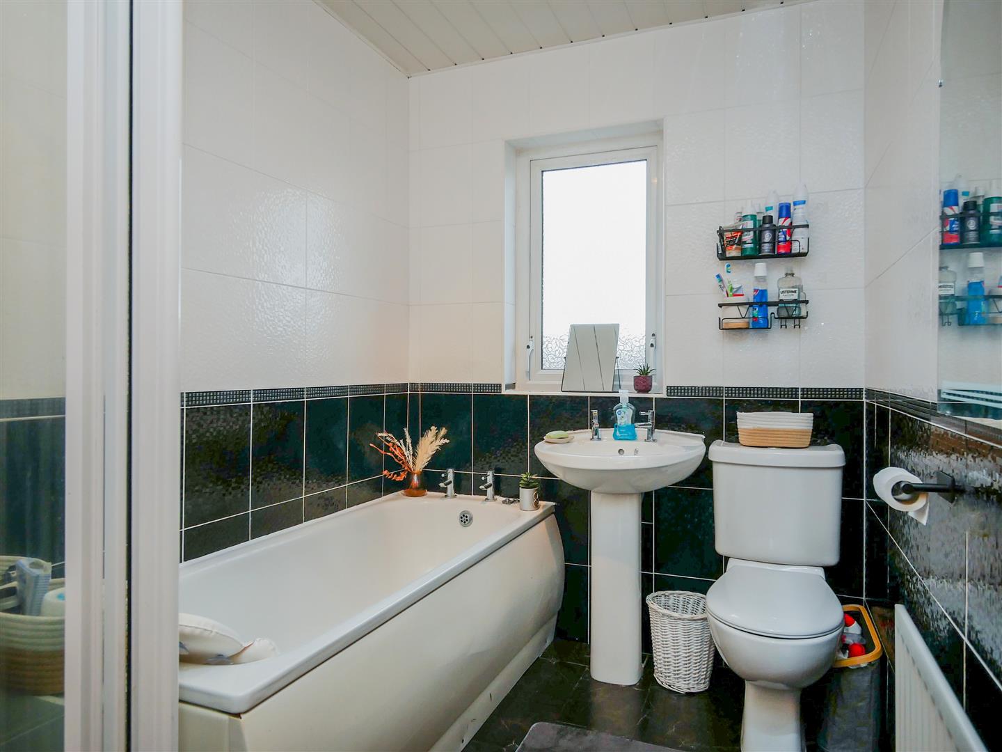White bathroom suite comprising of panelled bath with stainless steel taps, pedestal wash hand basin, low flush w.c and corner shower cubicle. Fully tiled walls and tile effect vinyl flooring.