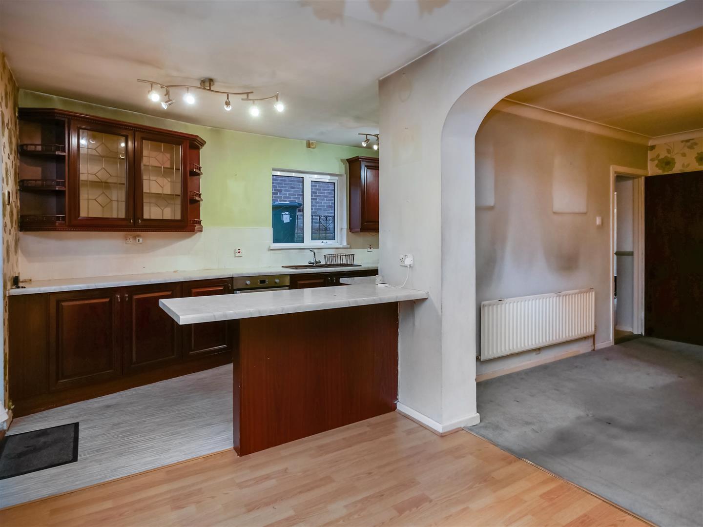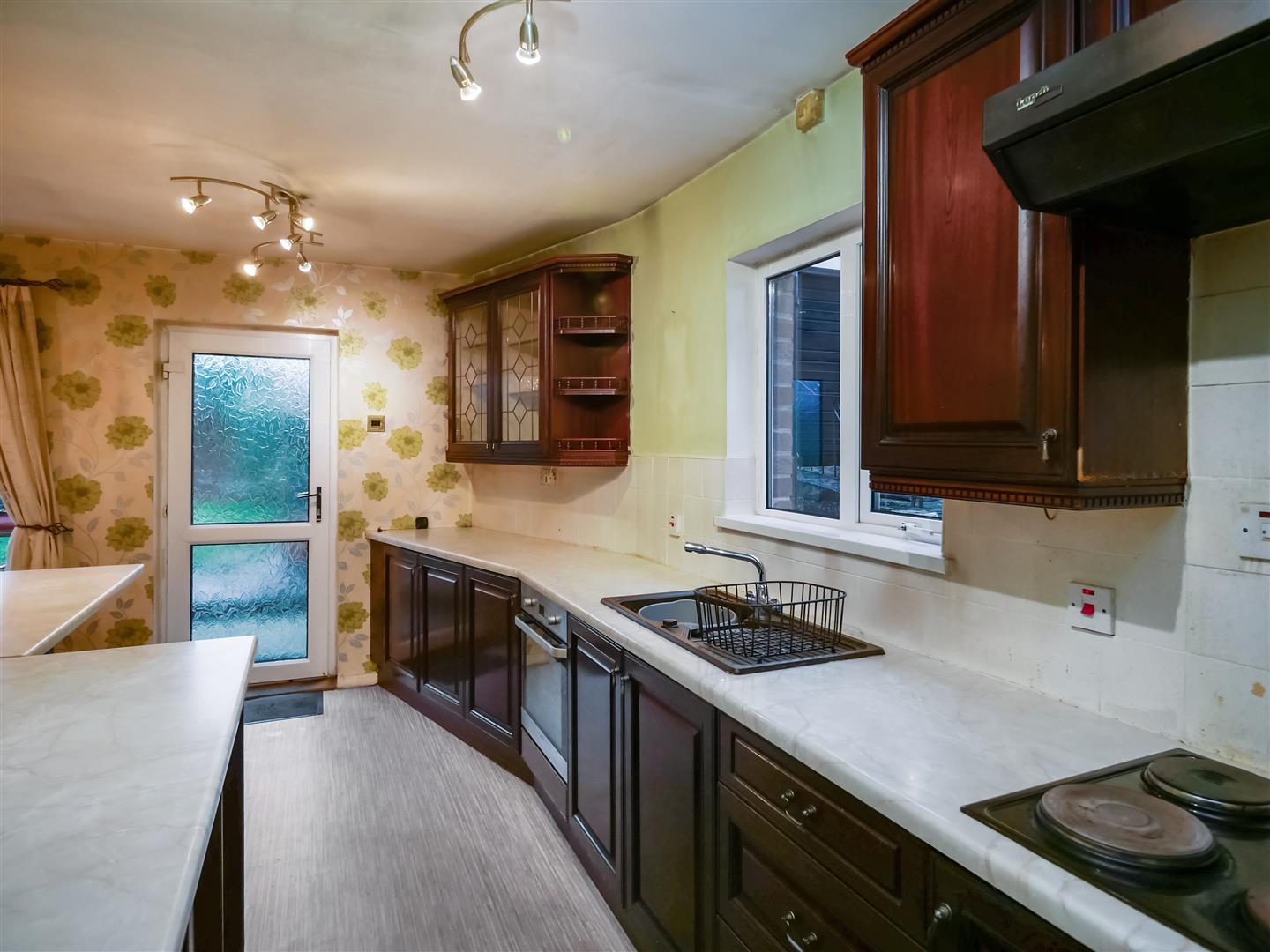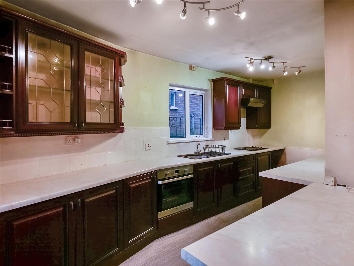 Full range of high and low level units, single drainer stainless steel sink unit with mixer taps, built in 4 ring hob, overhead extractor fan, stainless steel oven, plumbed for washing machine, Part tiled walls. Breakfast bar.