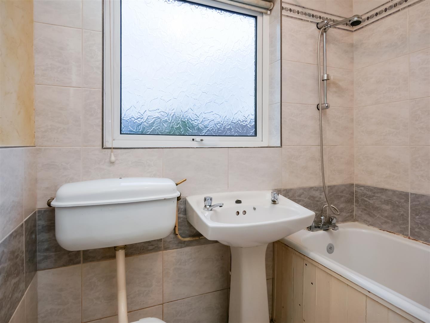 Comprising panelled bath with mixer taps and chrome shower, pedestal wash hand basin, low flush w.c Part tiled walls. Tongue and groove ceiling.