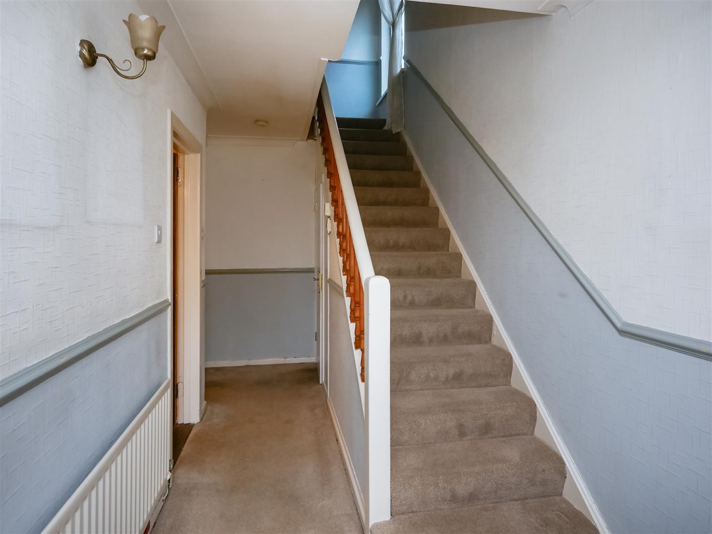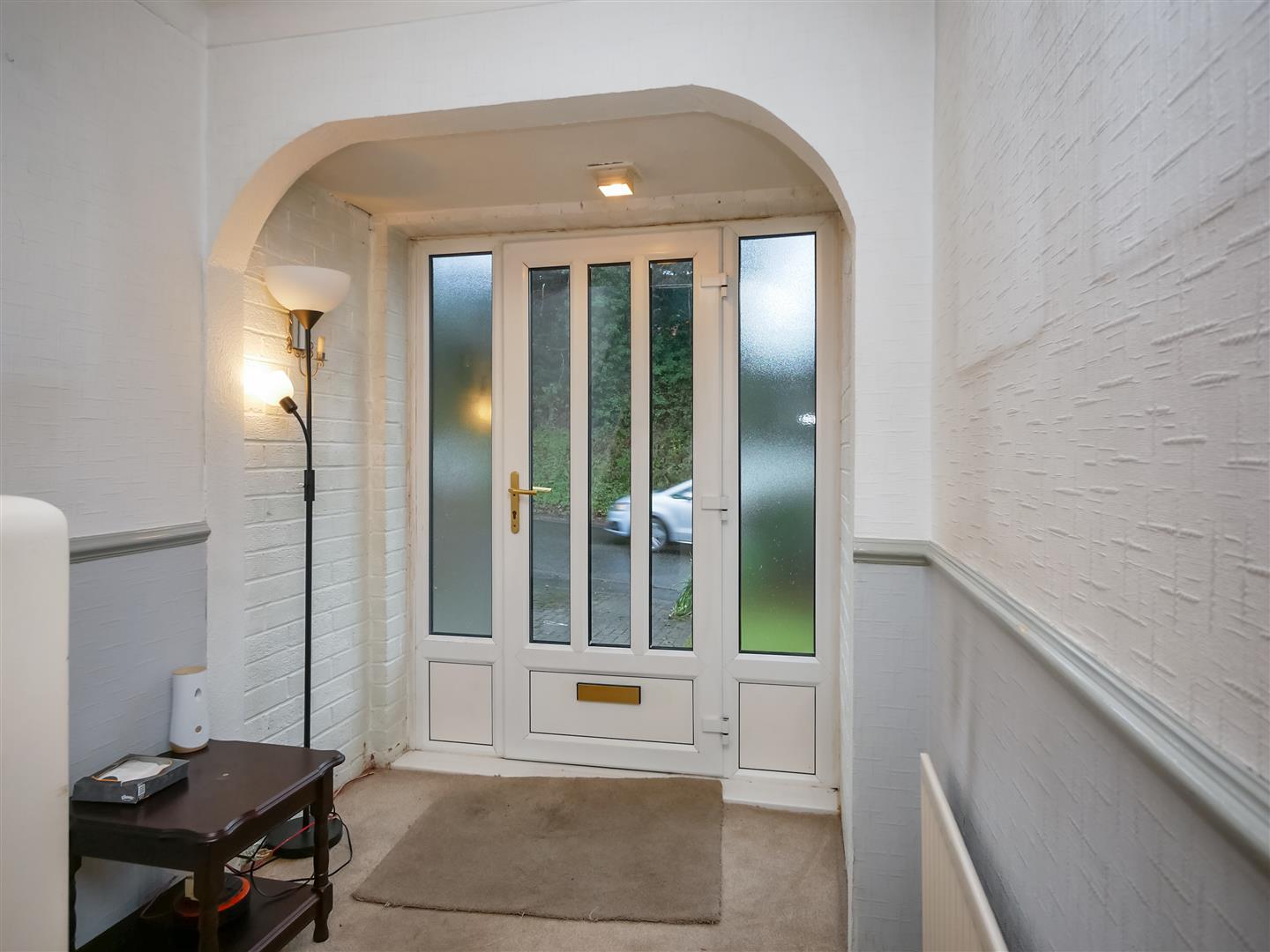 Pvc glass panelled front door with glazed side panels to entrance hall.