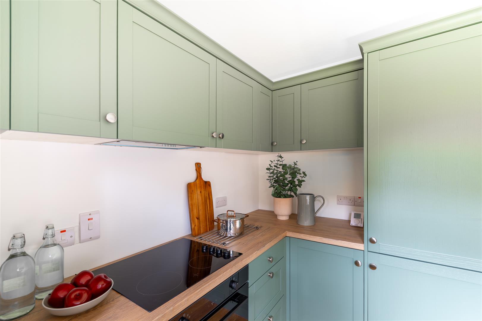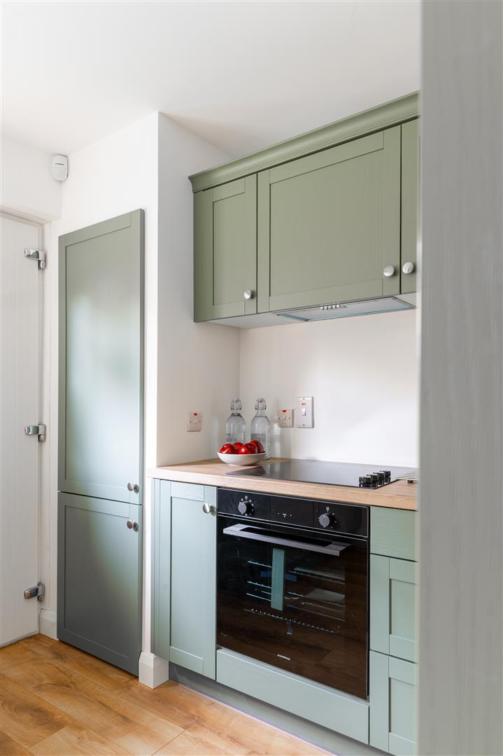 New shaker style fitted kitchen with wood effect work surfaces, built-in four ring hob and under oven, over head extractor fan, integrated washing machine, housing for gas boiler. Laminate flooring. Access to rear garden.