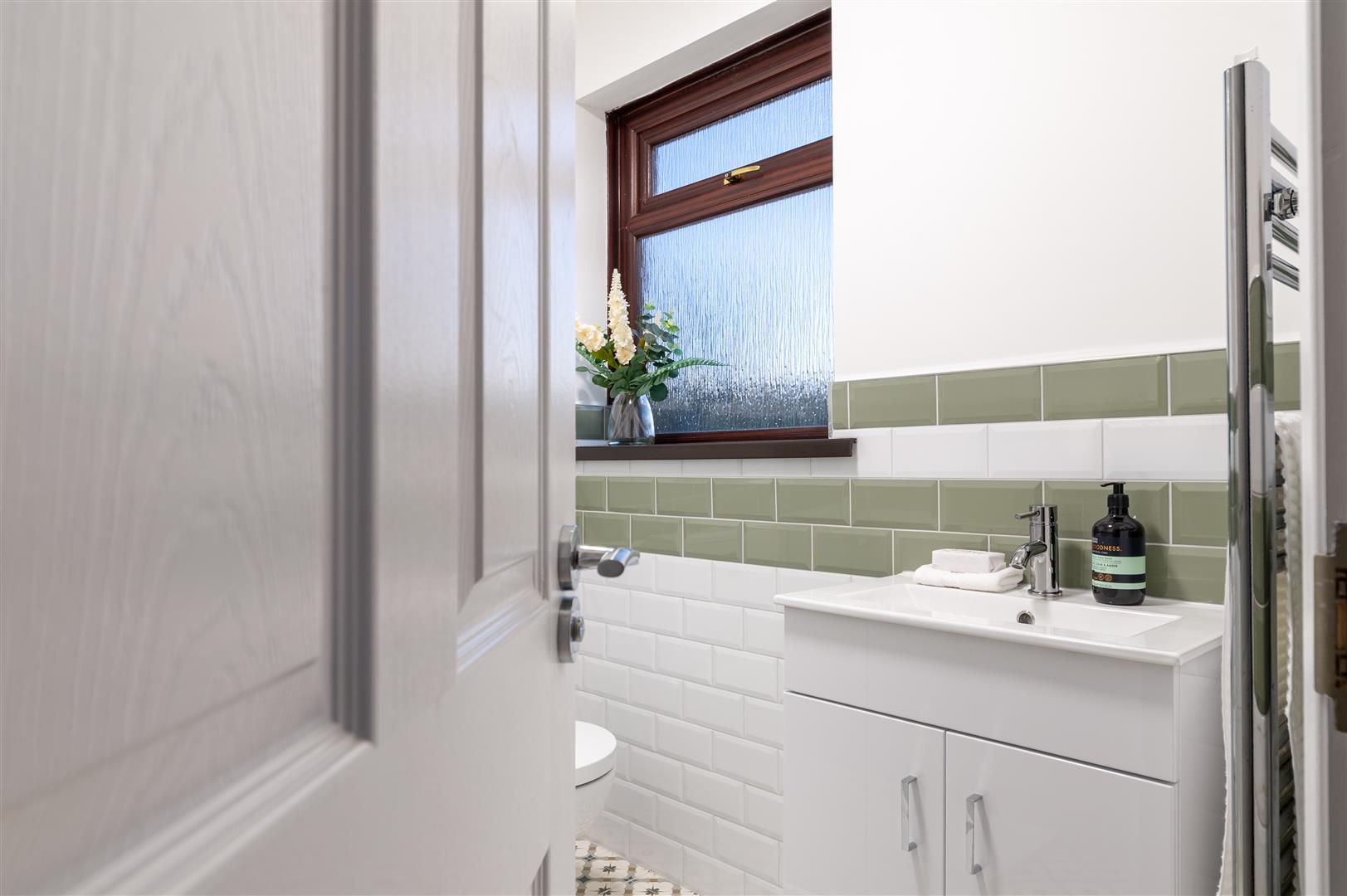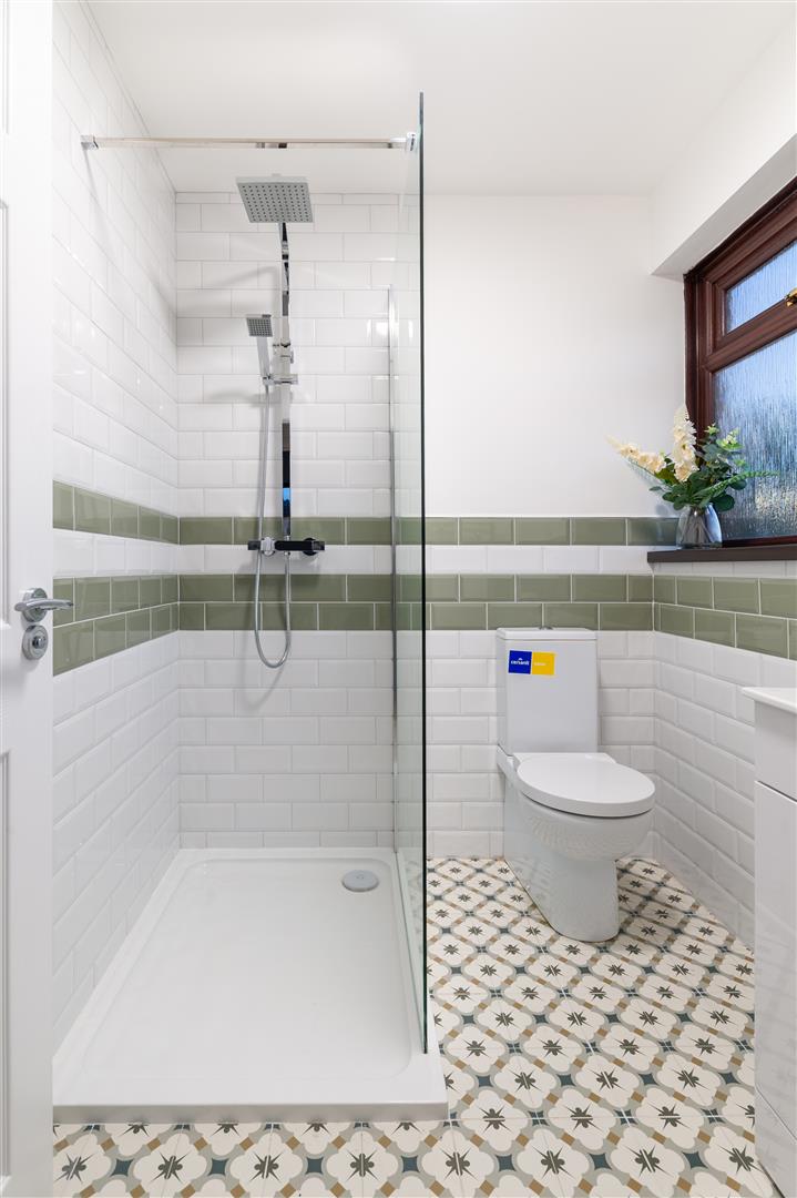 Comprising large walk in shower cubicle with chrome shower unit with drench head and hand shower, wash hand basin with mixer taps and storage below, low flush w/c, part tiled walls, tiled floor and heated chrome towel rail.