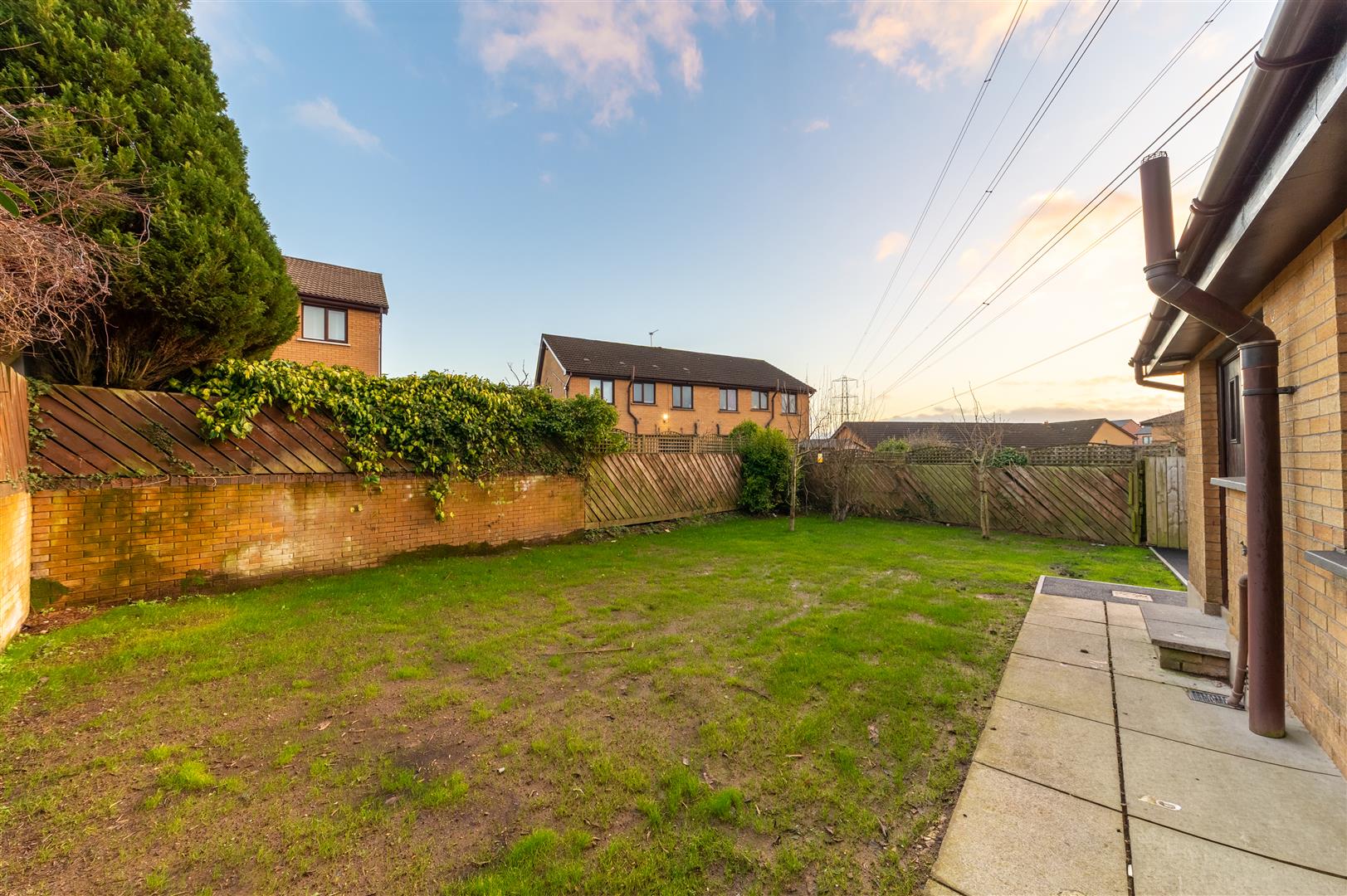 Large enclosed rear garden area, bordered by brick wall and timber fencing. (garden recently seeded)