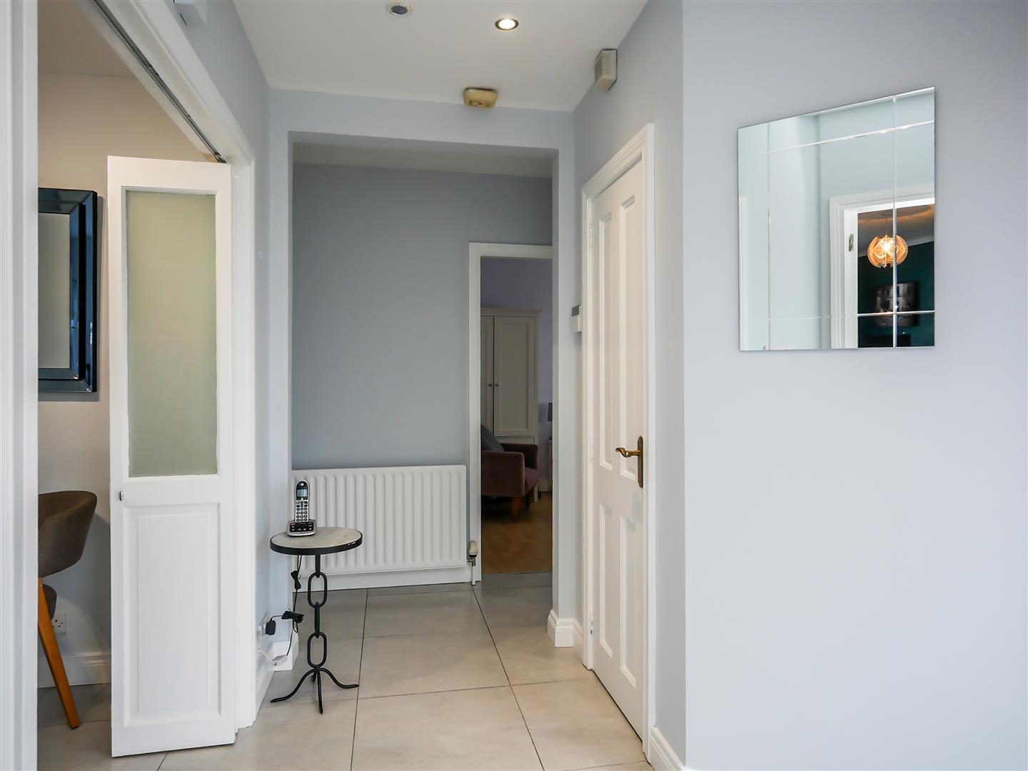 Pvc glass panelled front door with glazed side panels to entrance hall. Tiled flooring. Built-in storage.