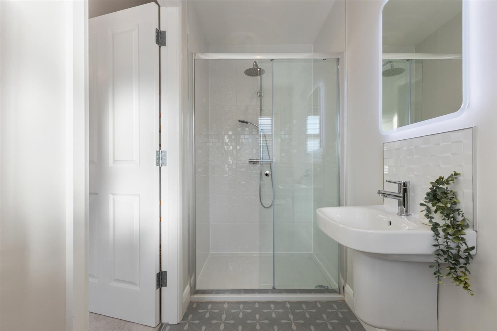 Comprising shower cubicle with chrome fittings, wash hand basin, low flush w/c.