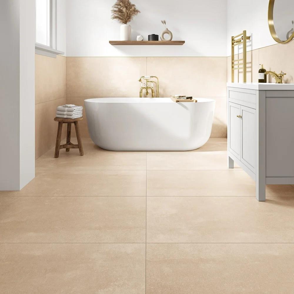 Heated towel rail, ceramic tiled floor.