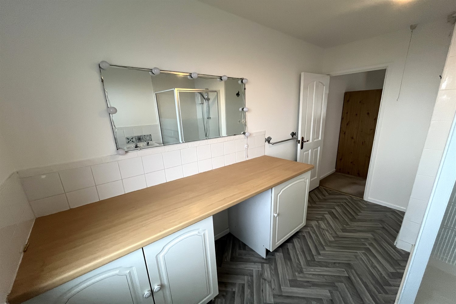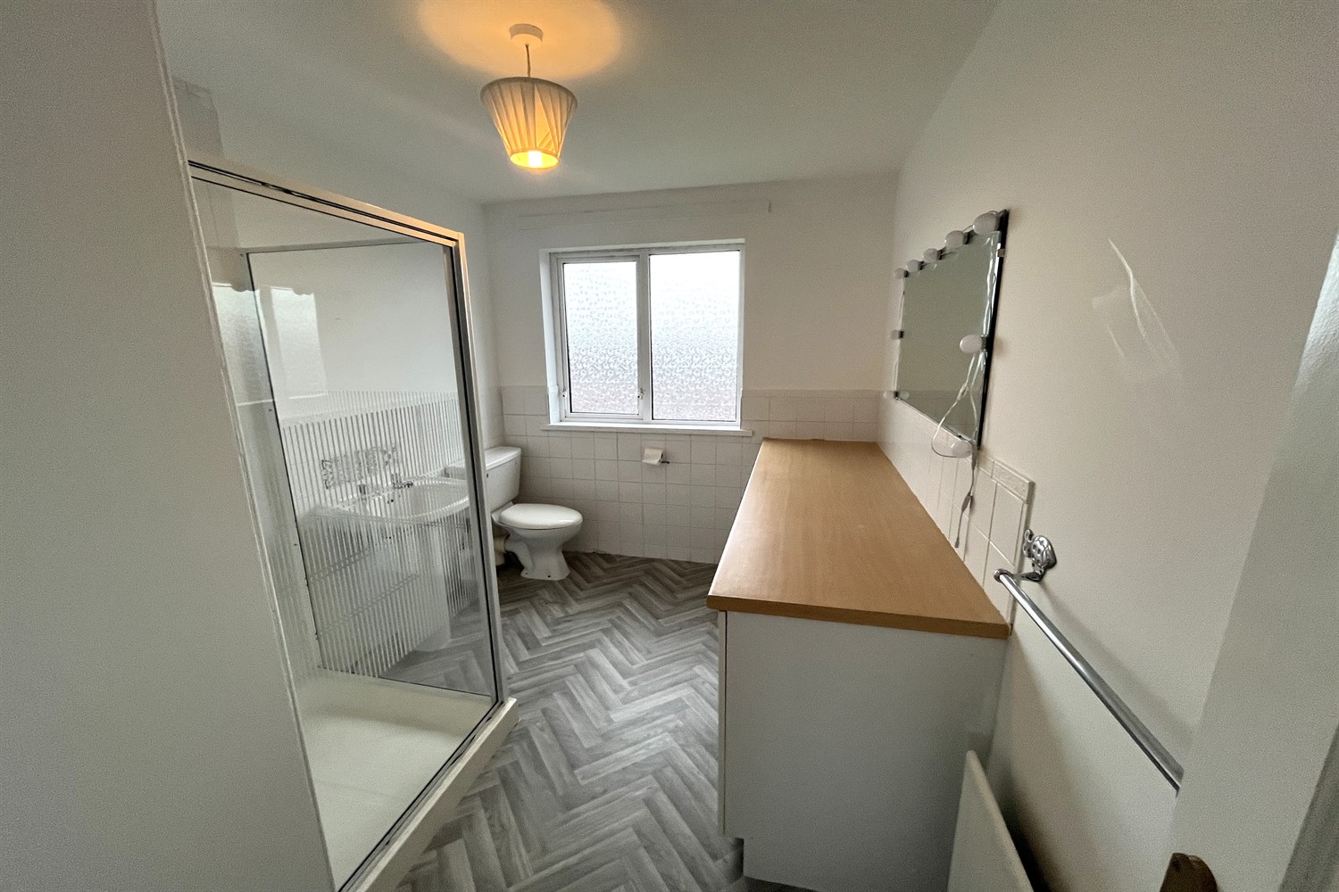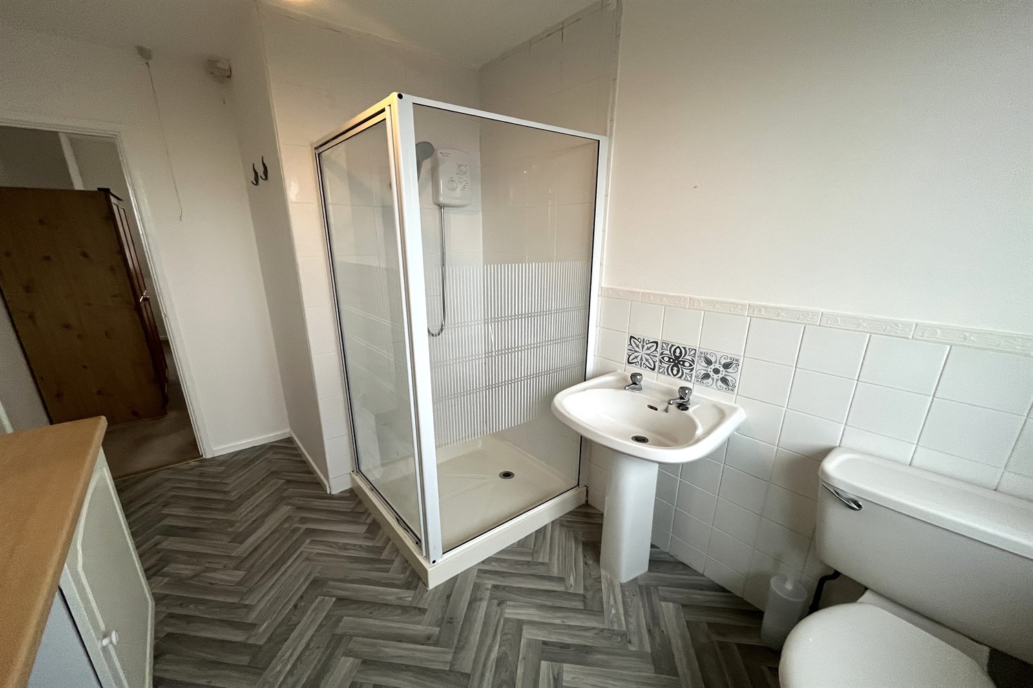 Partially tiled walls, single panelled radiator, white suite comprising, w.c., vanity unit with wash hand basin, shower cubicle with electric shower.
