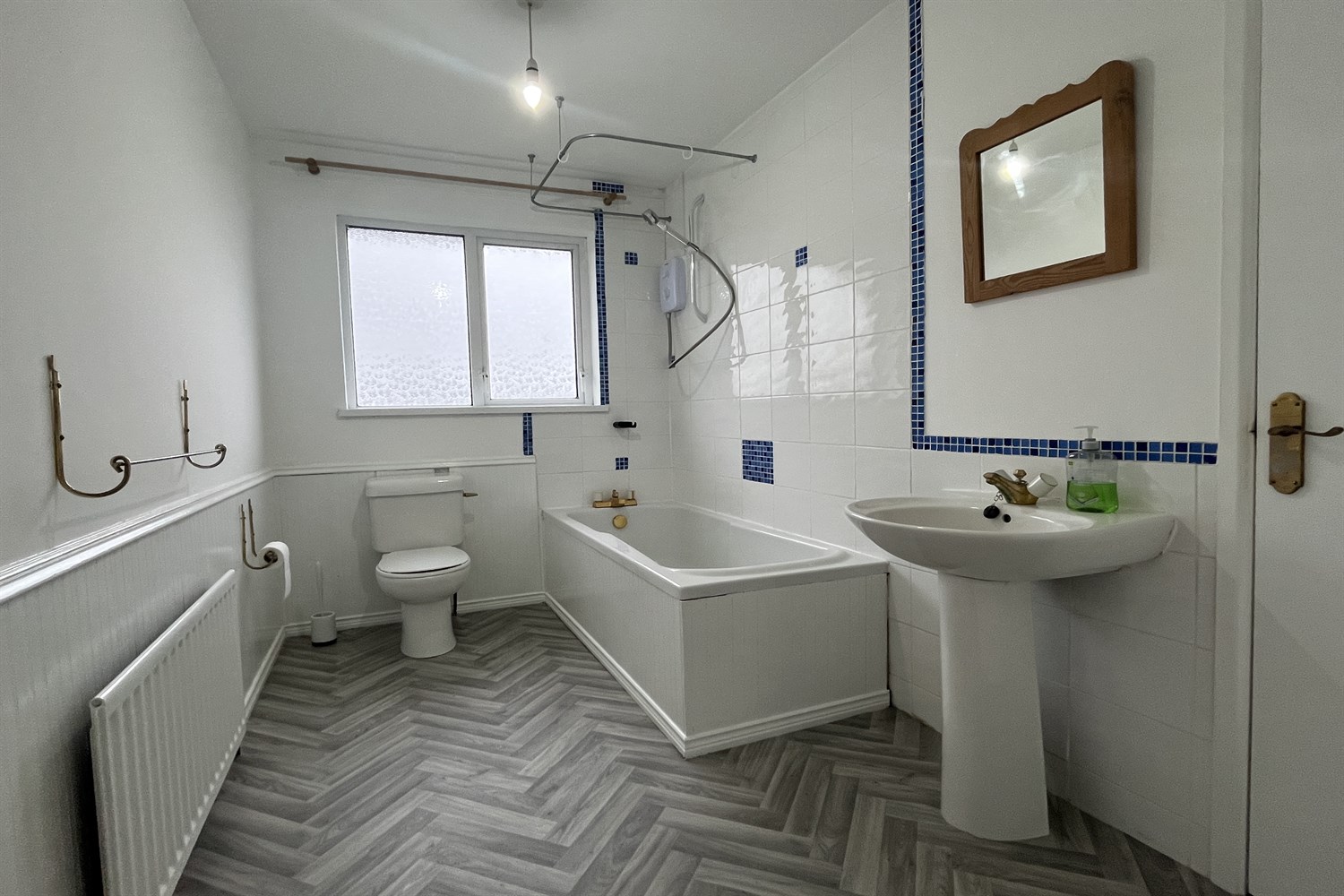 Partially panelled and tiled walls, single panelled radiator, white suite comprising, w.c., panelled bath with electric shower over, wash hand basin, wc, hotpress