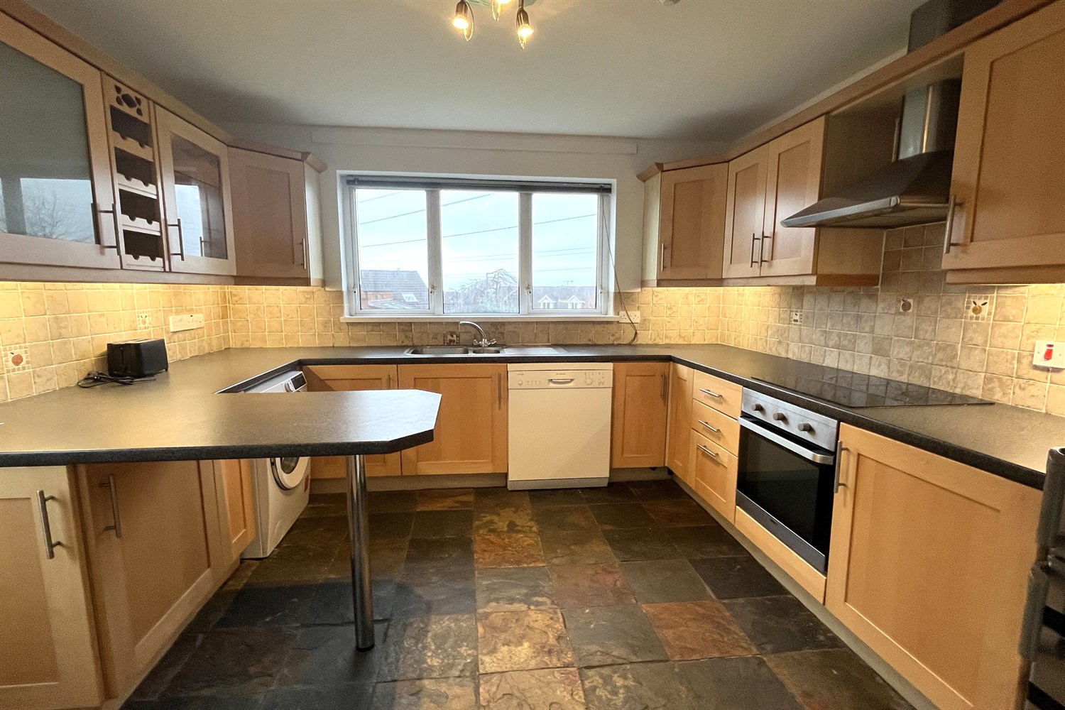 Chinese slate flooring, single panelled radiator, 1 1/2 bowl stainless steel sink unit with mixer tap, range of high and low level units, breakfast bar, 'Zanussi' fridge freezer, electric oven and hob, 'Hoover' washing machine,, 'Bosch' dish washer.