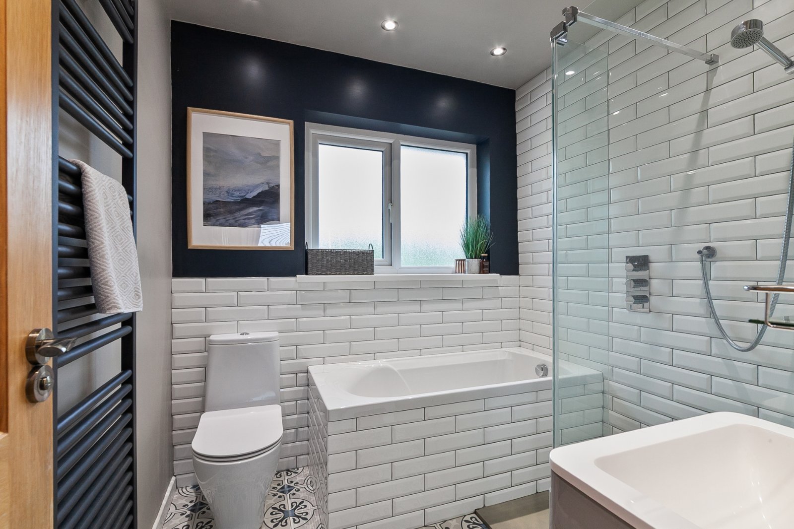 Tiled floor, bath with tiled surround, pedestal wash hand basin with vanity unit, fully tiled shower cubicle with rainhead shower