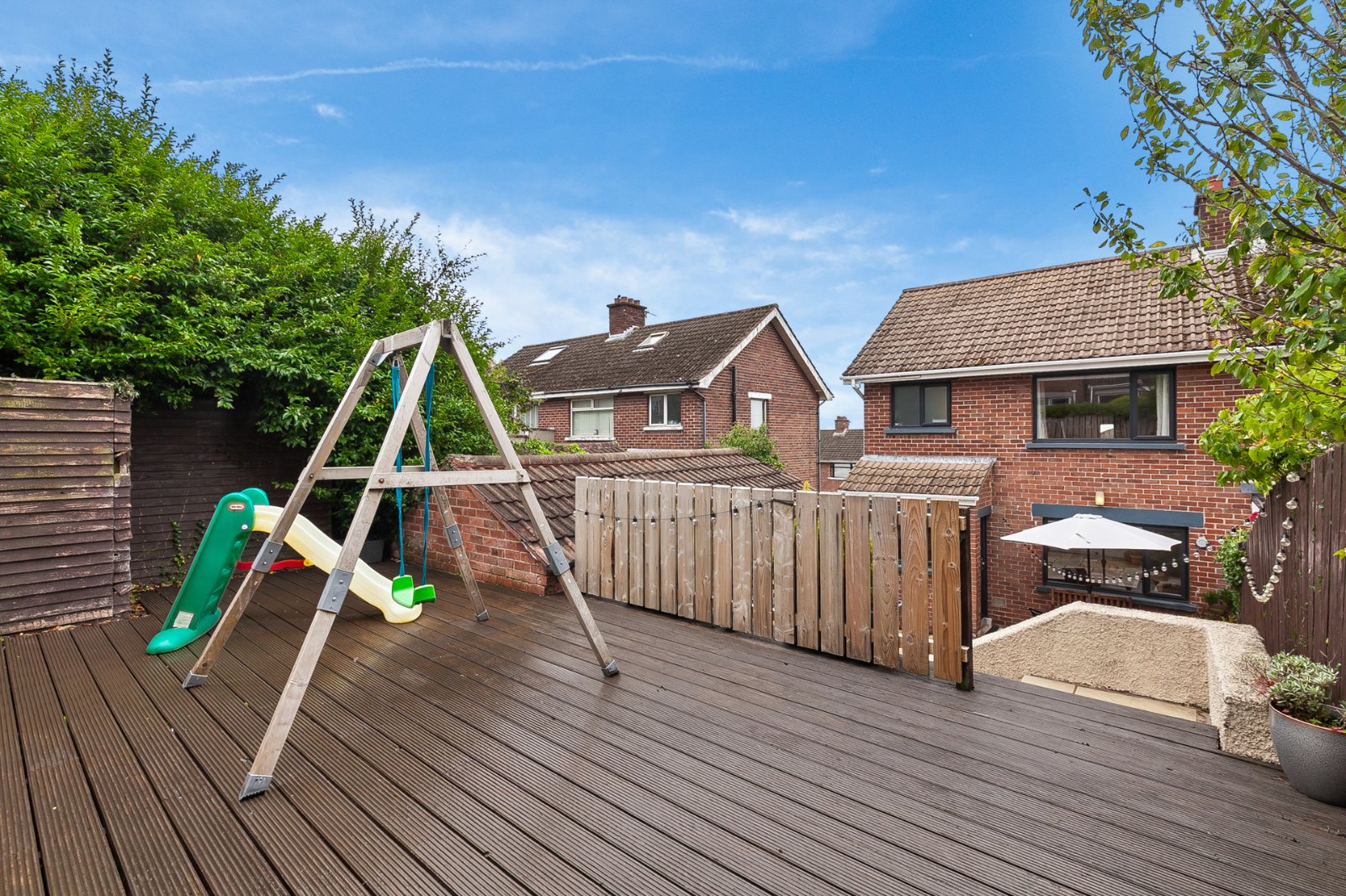 Concrete driveway to the side of the house. Front garden in lawn. Enclosed paved rear garden with steps to decked sitting area