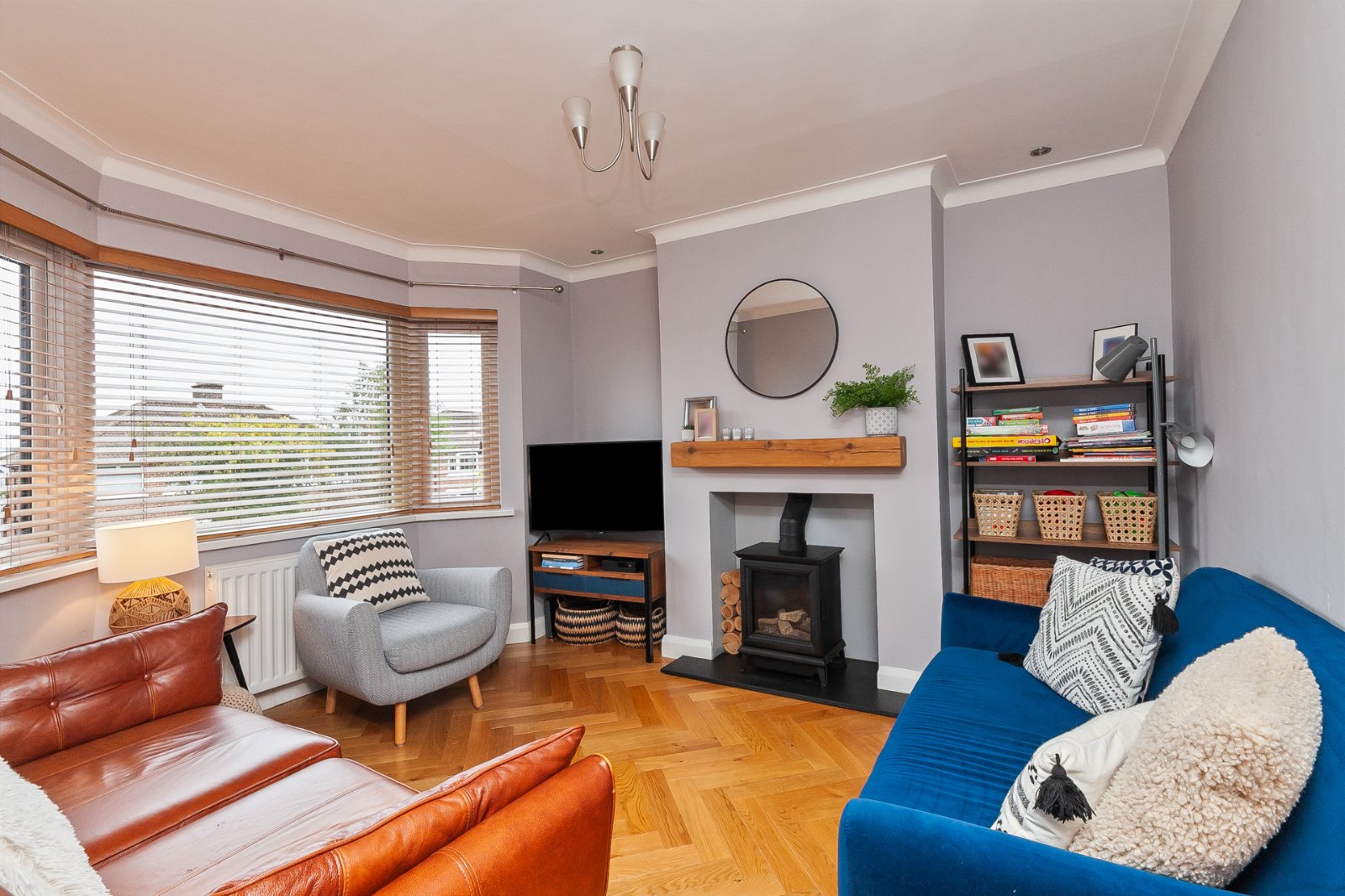 Solid wood parquet floor, remote controlled gas stove with slate hearth and solid wood beam