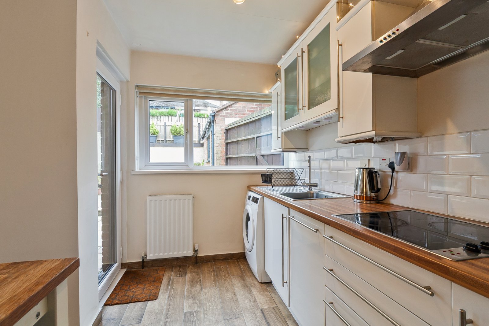 Tiled floor, range of high and low level units, eye-level electric oven, 4 ring ceramic hob, stainless steel extractor fan, integrated dishwasher, stainless steel sink unit, plumbed for washing machine, part tiled walls, uPVC double glazed door leading outside