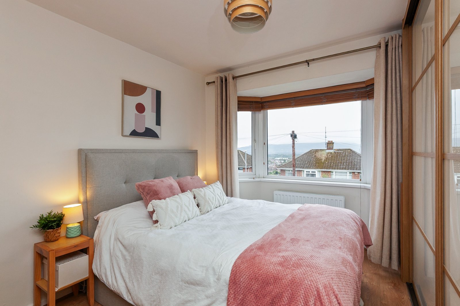 Laminate wood floor, mirror slide robes