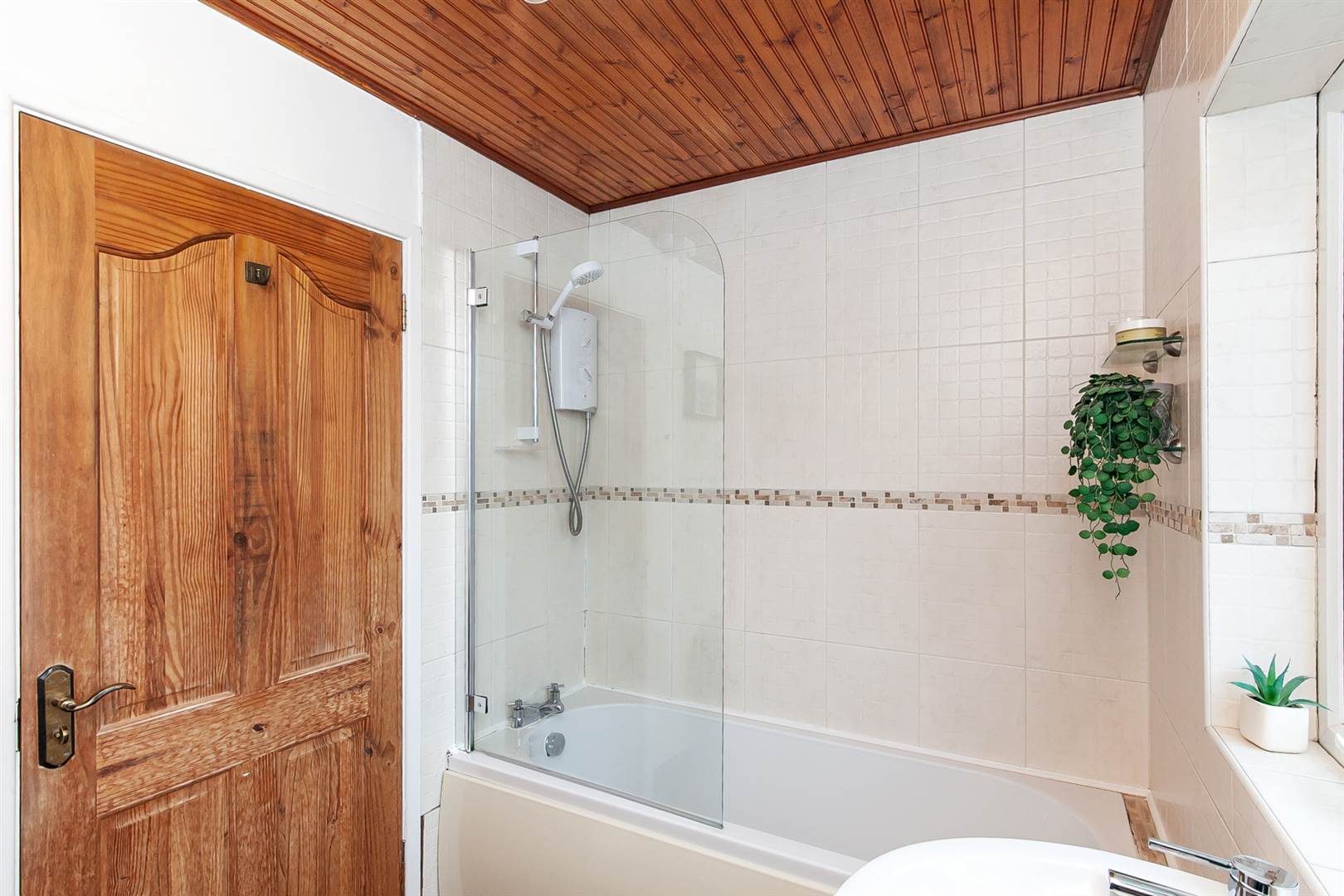 White suite comprising panelled bath with mixer tap, Mira Sport electric shower, low flush wc, pedestal wash hand basin, part tiled walls, ceramic tiled floor.