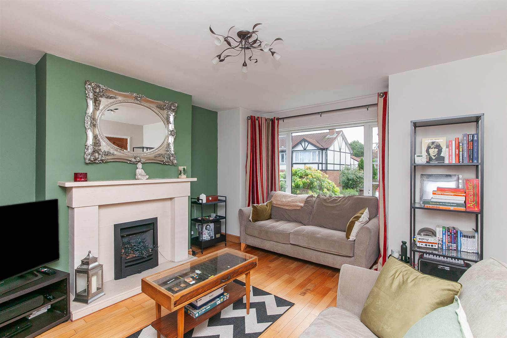Living room with large picture window and gas fire