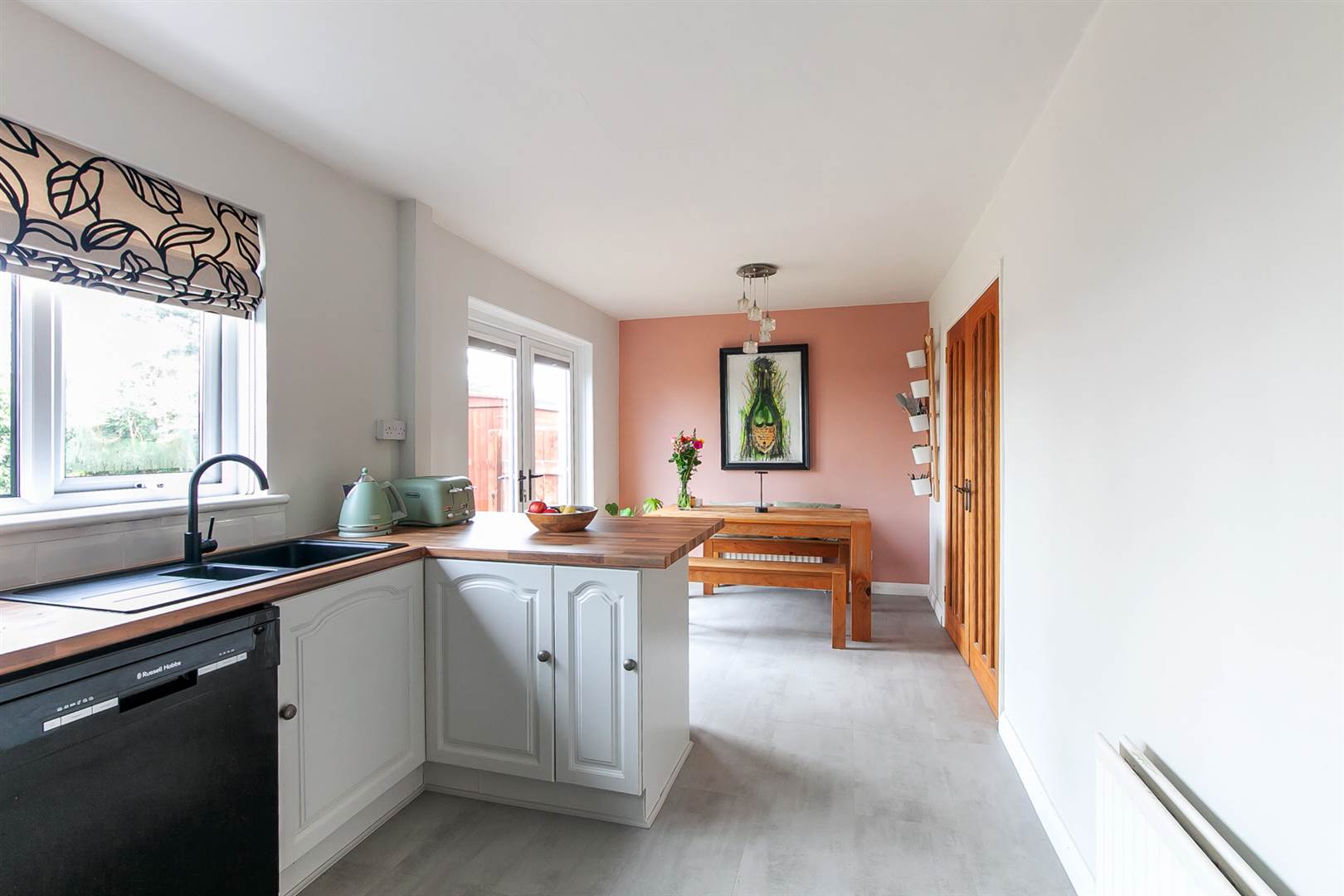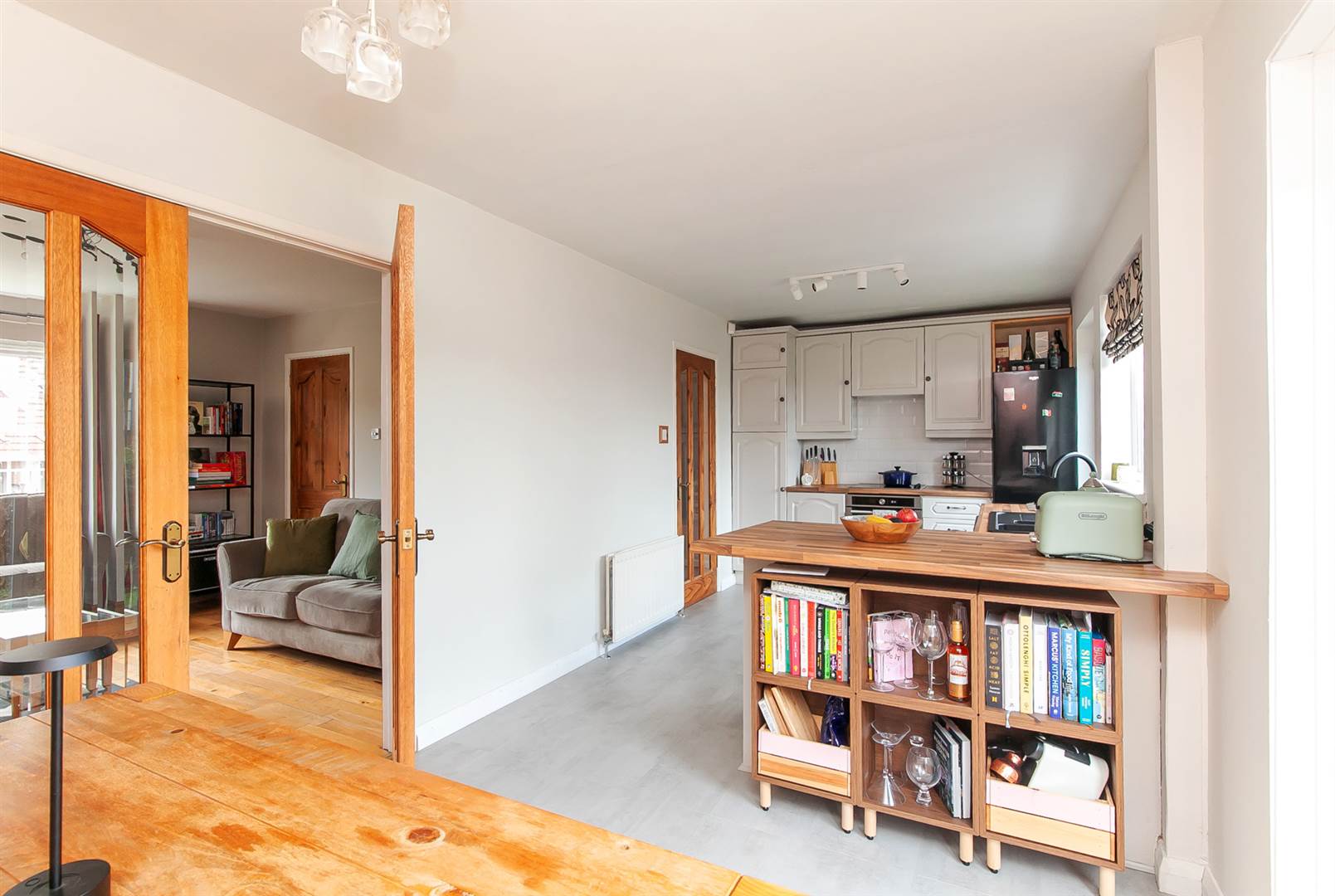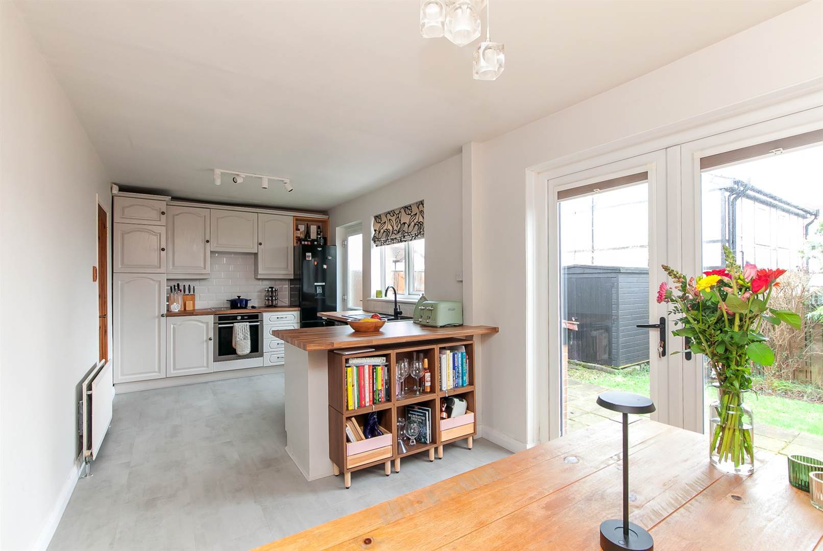 Kitchen opening to dining area, kitchen with integrated appliances and access to rear garden