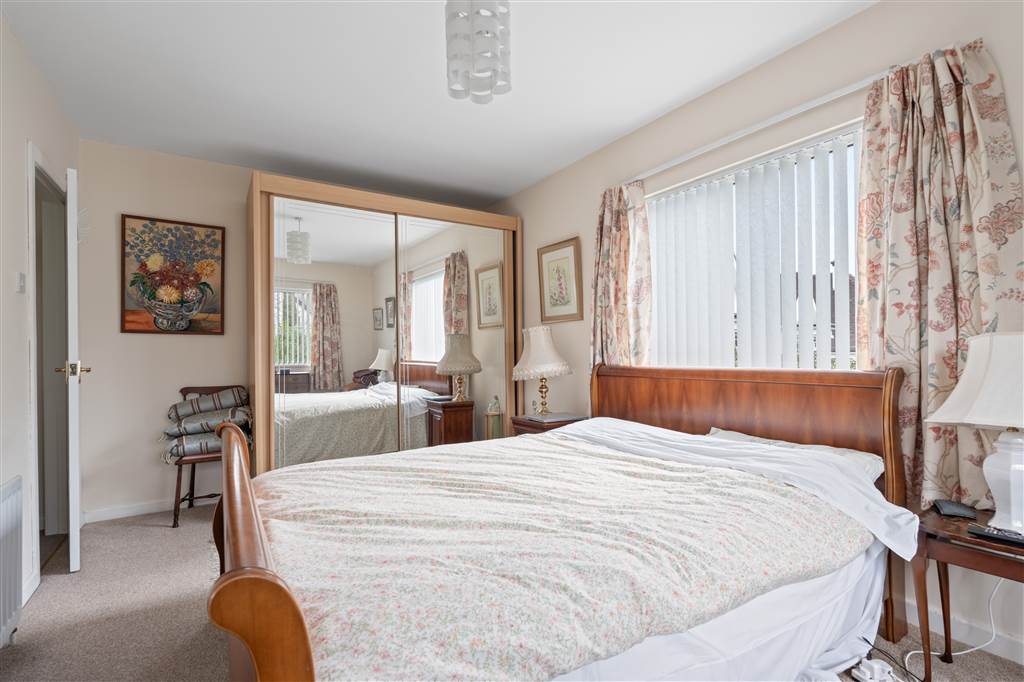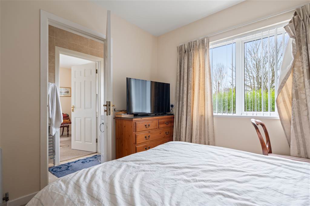 With 3-piece white suite comprising LFWC, WHB with built-in vanity unit and panelled bath with shower over. Heated towel rail. Hot-press with shelved storage. Part tiled walls. Tiled flooring.