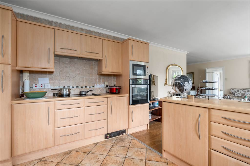 With a range of eye and low-level fitted units, 1 1/4 bowl stainless-steel sink unit and drainer. Integrated four ring electric hob with extractor fan over. Integrated oven. Integrated microwave. Integrated fridge. Plumbed for dishwasher. Larder cupboard. Cutlery drawers. Saucepan drawers. Coving to ceiling. Tiled walls. Tiled flooring. Open plan to lounge/dining room.