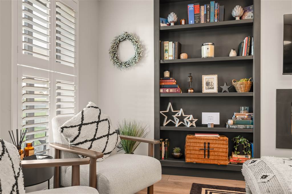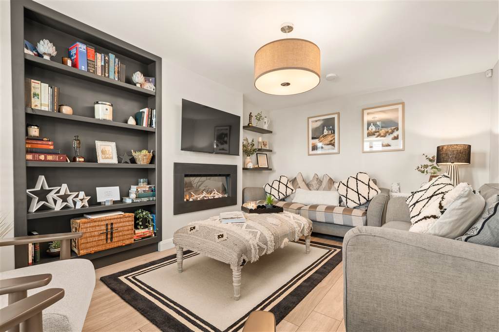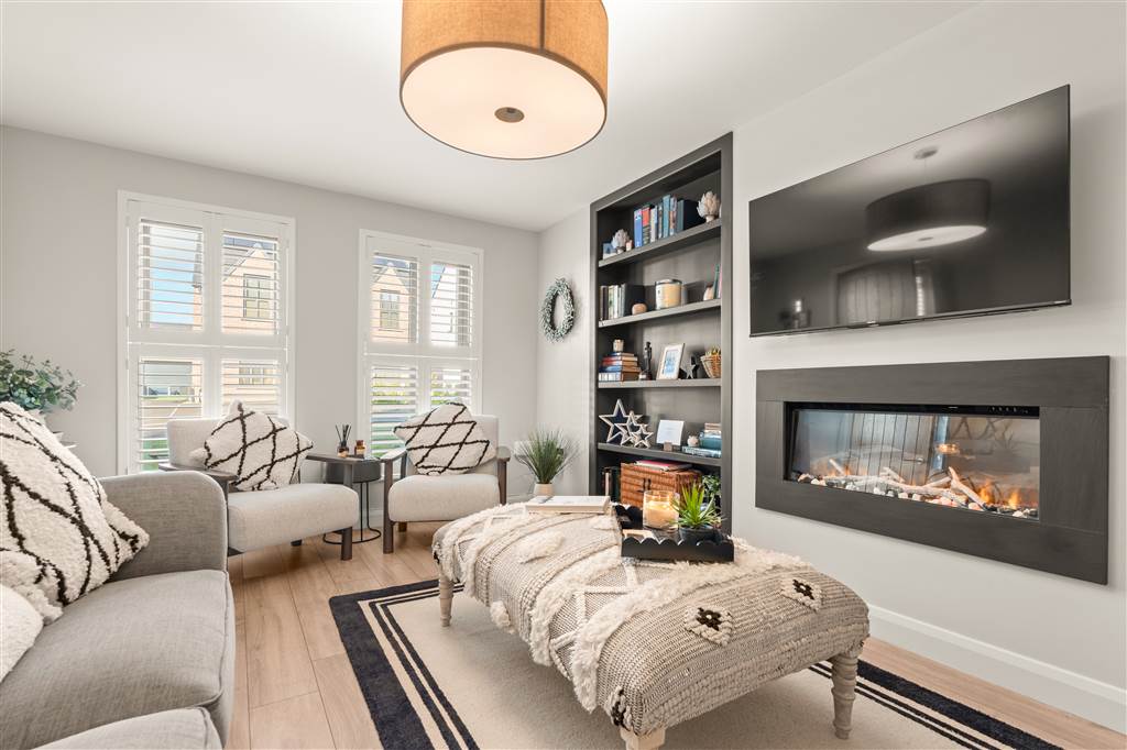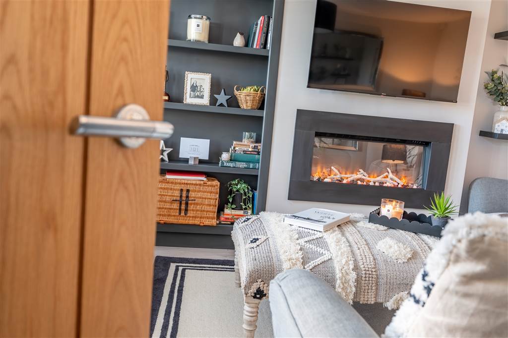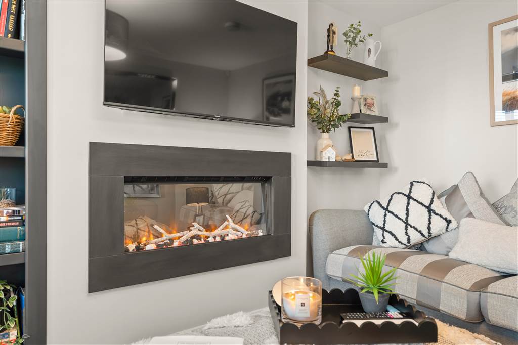 With wall-mounted electric fireplace. Laminated wooden flooring.
