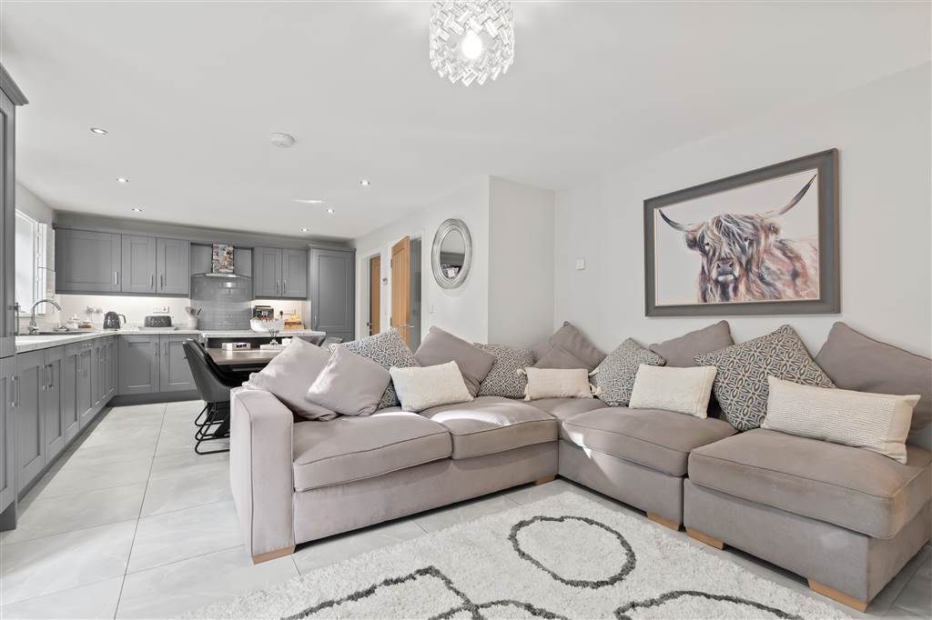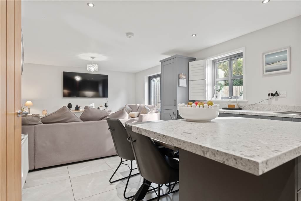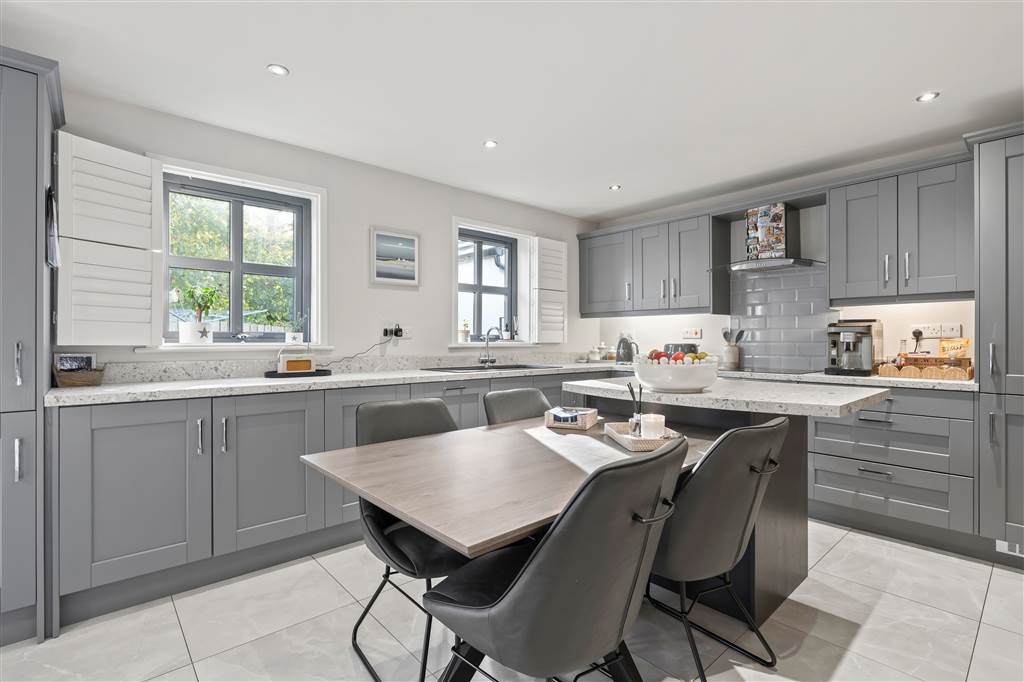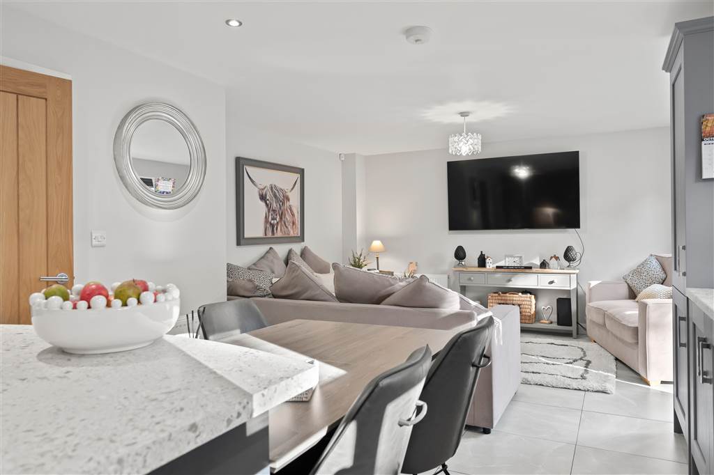 With a range of eye and low-level fitted units, 1 1/4 bowl sink unit and drainer with stainless-steel mixer tap. Integrated four ring electric hob and oven with stainless-steel extractor fan over. Integrated fridge-freezer. Integrated dishwasher. Cutlery drawer. Saucepan drawers. Larder cupboard. Kitchen island with seating area. Spacious living/dining area. Under cabinet lighting. Spot lighting to ceiling. Tiled flooring. PVC double doors to rear.