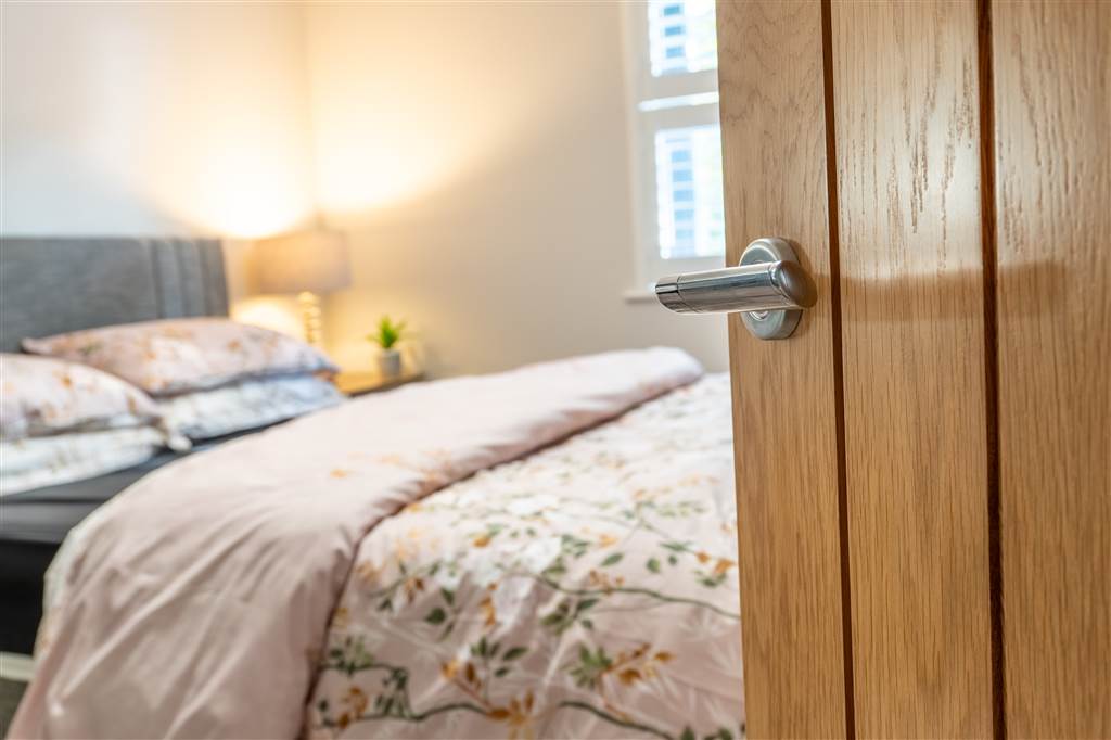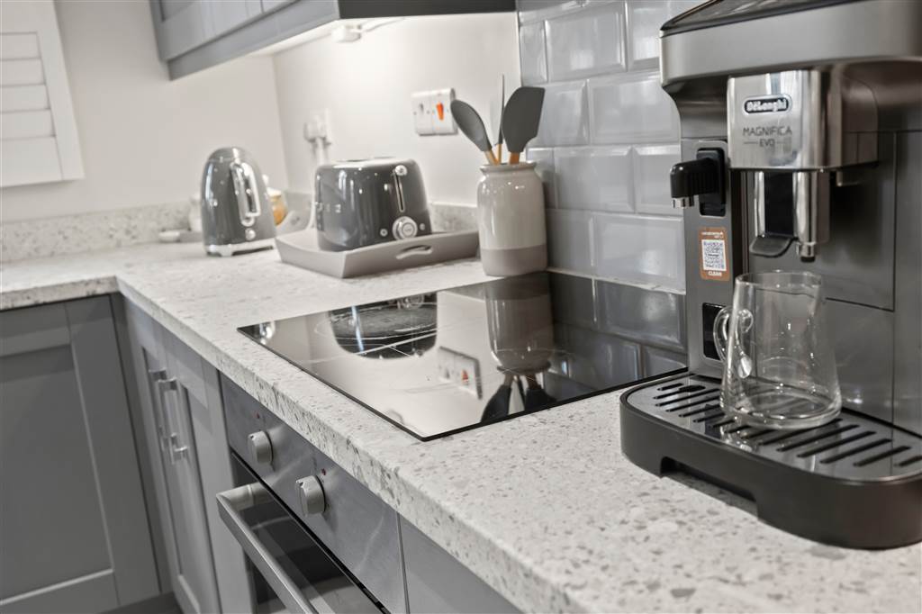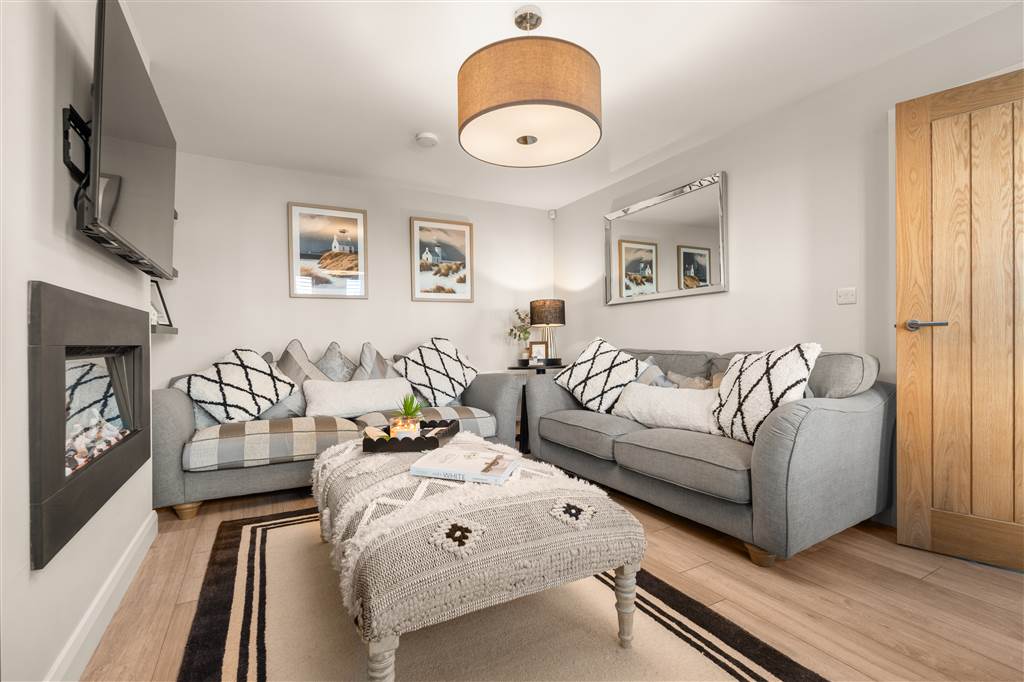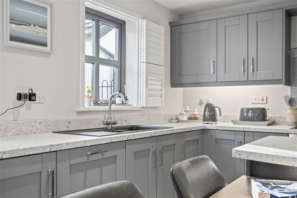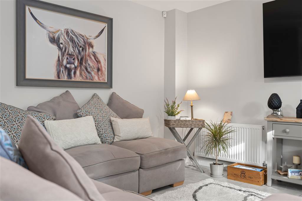 With a range of eye and low-level fitted units, 1 1/4 bowl sink unit and drainer with stainless-steel mixer tap. Integrated four ring electric hob and oven with stainless-steel extractor fan over. Integrated fridge-freezer. Integrated dishwasher. Cutlery drawer. Saucepan drawers. Larder cupboard. Kitchen island with seating area. Spacious living/dining area. Under cabinet lighting. Spot lighting to ceiling. Tiled flooring. PVC double doors to rear.